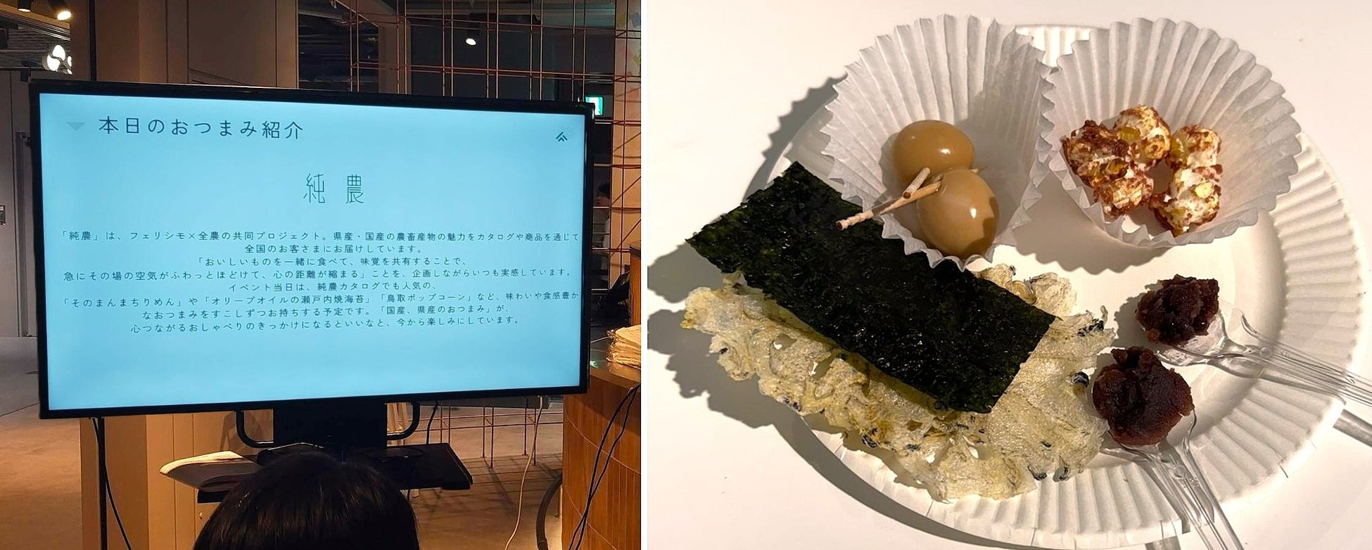 フェリシモ×全農の共同プロジェクト「純農」から「そのまんまちりめん」や「オリーブオイルの瀬戸内焼海苔」など、国産・県産の味わい豊かなおつまみが提供され、f wineryからはワインが販売されました。これらの「食」を通じた交流は、五感を刺激し、スナックらしい和やかな雰囲気の中で参加者同士の心の距離を縮めるきっかけとなりました。