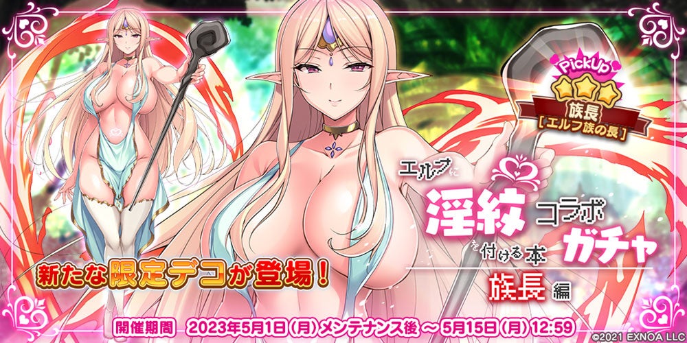 『救世少女 メシアガール おかわり』『エルフに淫紋を付ける本』とのコラボを記念したダメージチャレンジイベント開催!コラボガチャでは新たに「族長」が登場!各種GWキャンペーンも好評開催中!