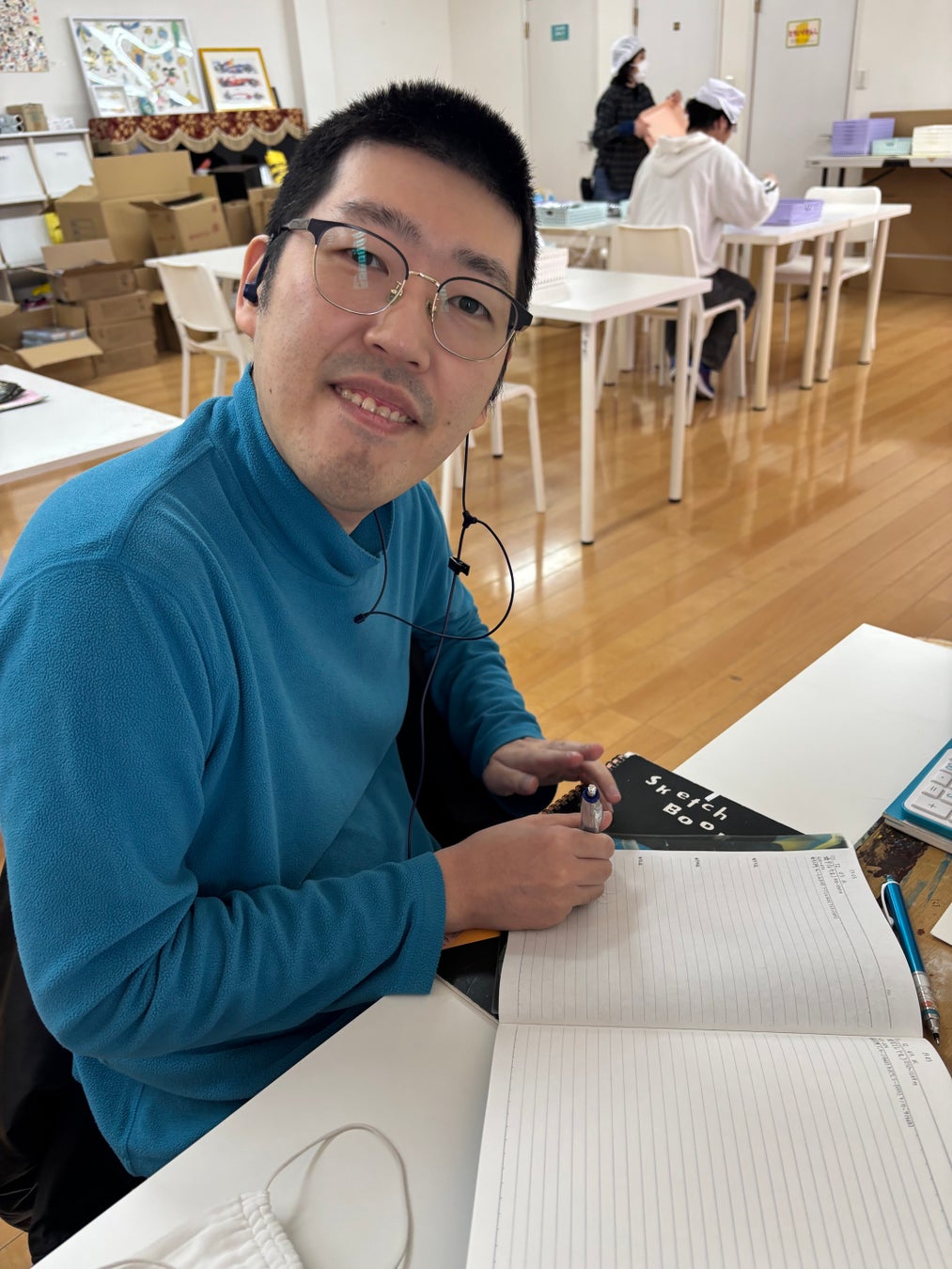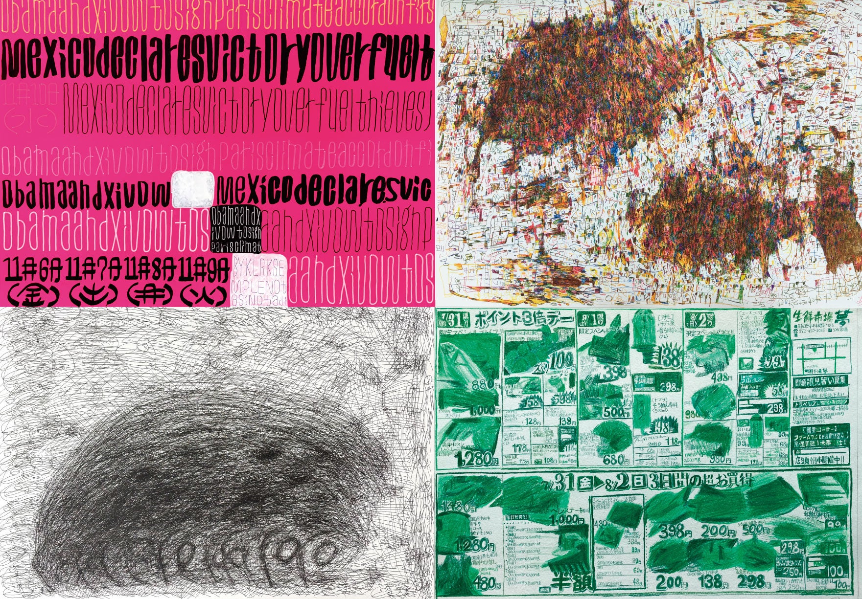 パソコンにラジオ、ゲーム機に湿度計。文明の利器を使いながら、自身に必要な情報をスケッチブックに描いていく。時には絵の具や色鉛筆を使っておしゃれな絵を描き、使用する画材も多岐にわたる。制作風景を覗き見ると、イヤホンをつけパソコンを見ながらラジオの電波を気にする様子はまるでビジネスマン。最近はFFやポケモンの攻略法など必要な情報をノートやスケッチブックに描きこんでいくスタイルは今も継続中。
