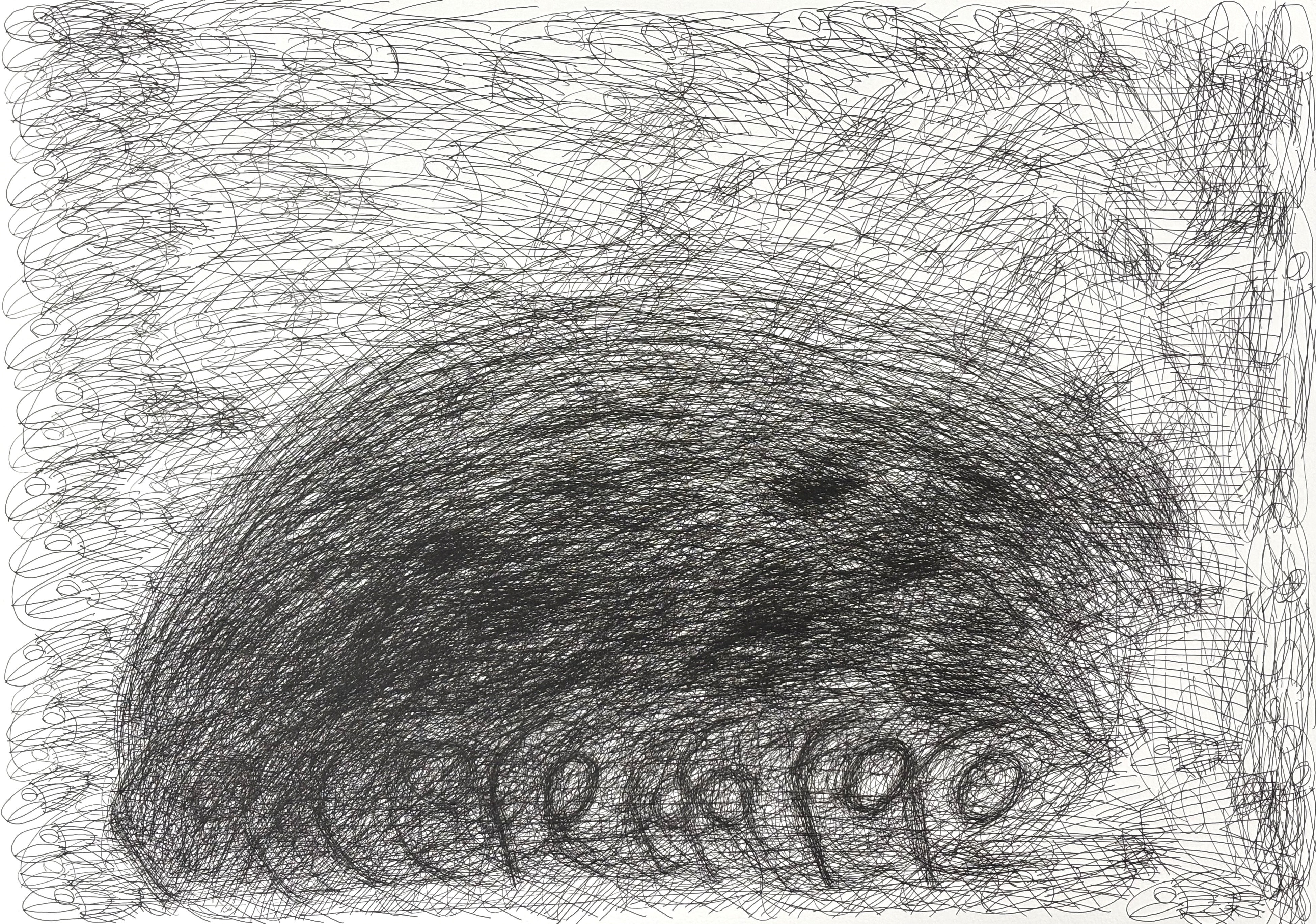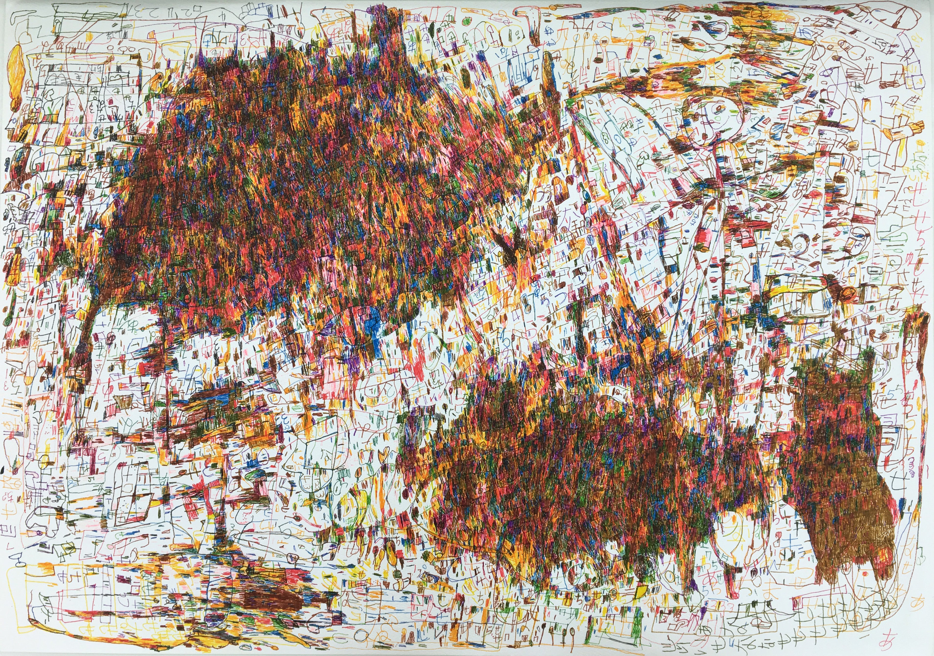 余白を埋めるように線や抽象的な図形が躍動的に描かれた作品には、作者の名前に由来する「あ」「な」「せ」の文字が隠されている。