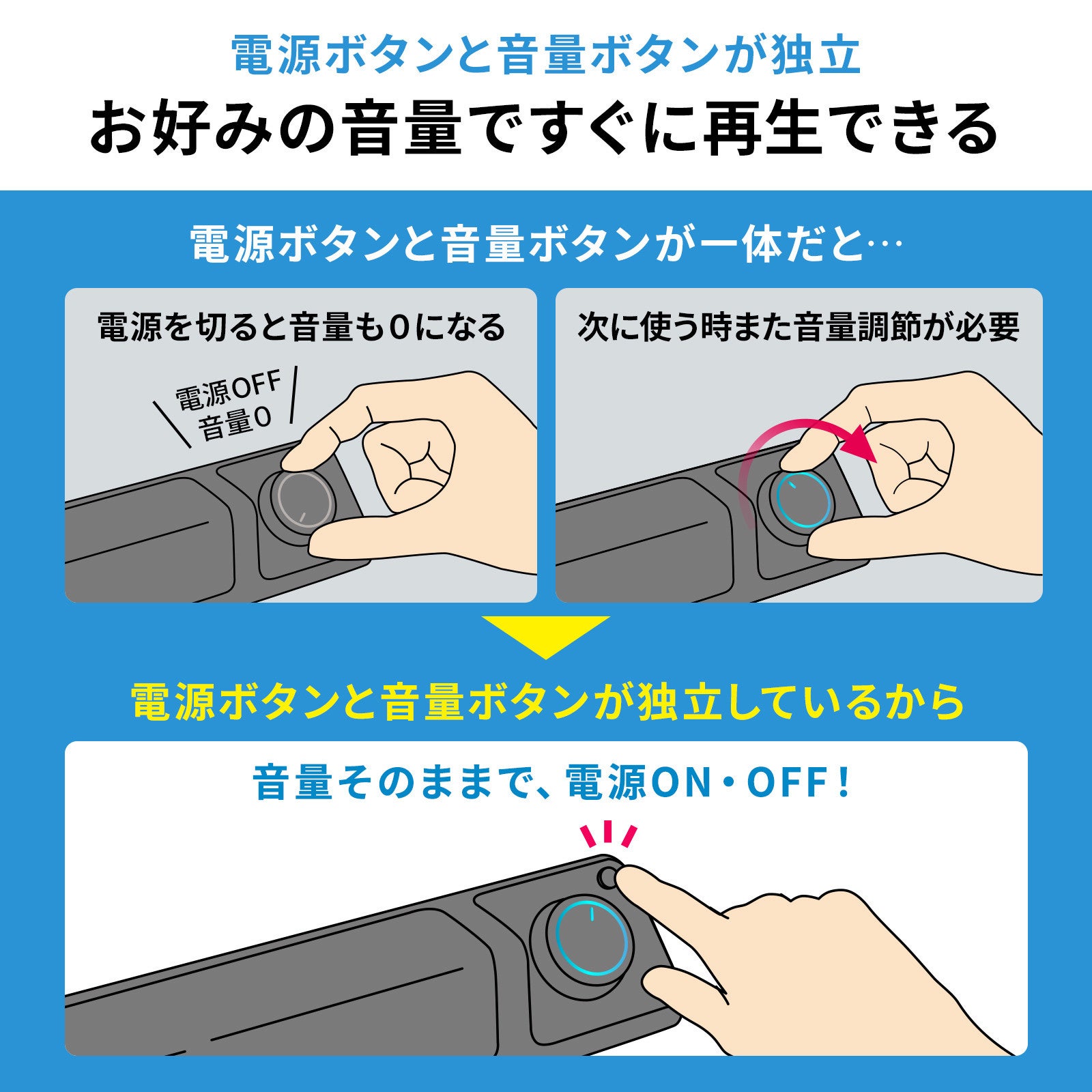 直感的に操作できる大型のボリュームコントロールを搭載しており、好みの音量に素早く調整できます。電源ボタンと音量ボタンは独立しているので、使用時に毎回音量調節する必要がありません。