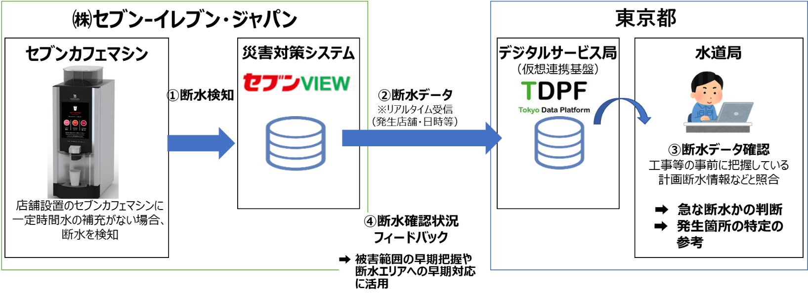 この度、協議会に参加していただいている株式会社セブン‐イレブン・ジャパン(以下「SEJ」)がTDPFを通じたデータ利活用の趣旨に賛同し、SEJの店舗に設置されているセブンカフェマシンの断水状況データを都に提供いただき、水道局が行う断水情報収集への活用可能性を探る実証を行います。