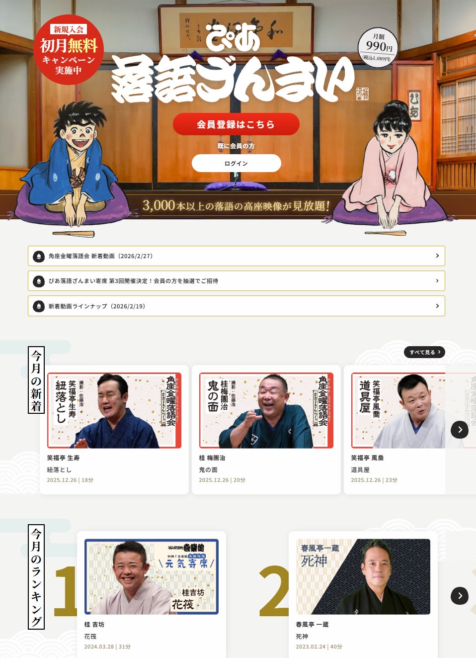 また、ただいま新規入会の初月無料キャンペーンを実施中。新規入会日(有料会員登録)から1ヶ月間は無料で高座映像の見放題サービスをお楽しみいただくことが出来ます。