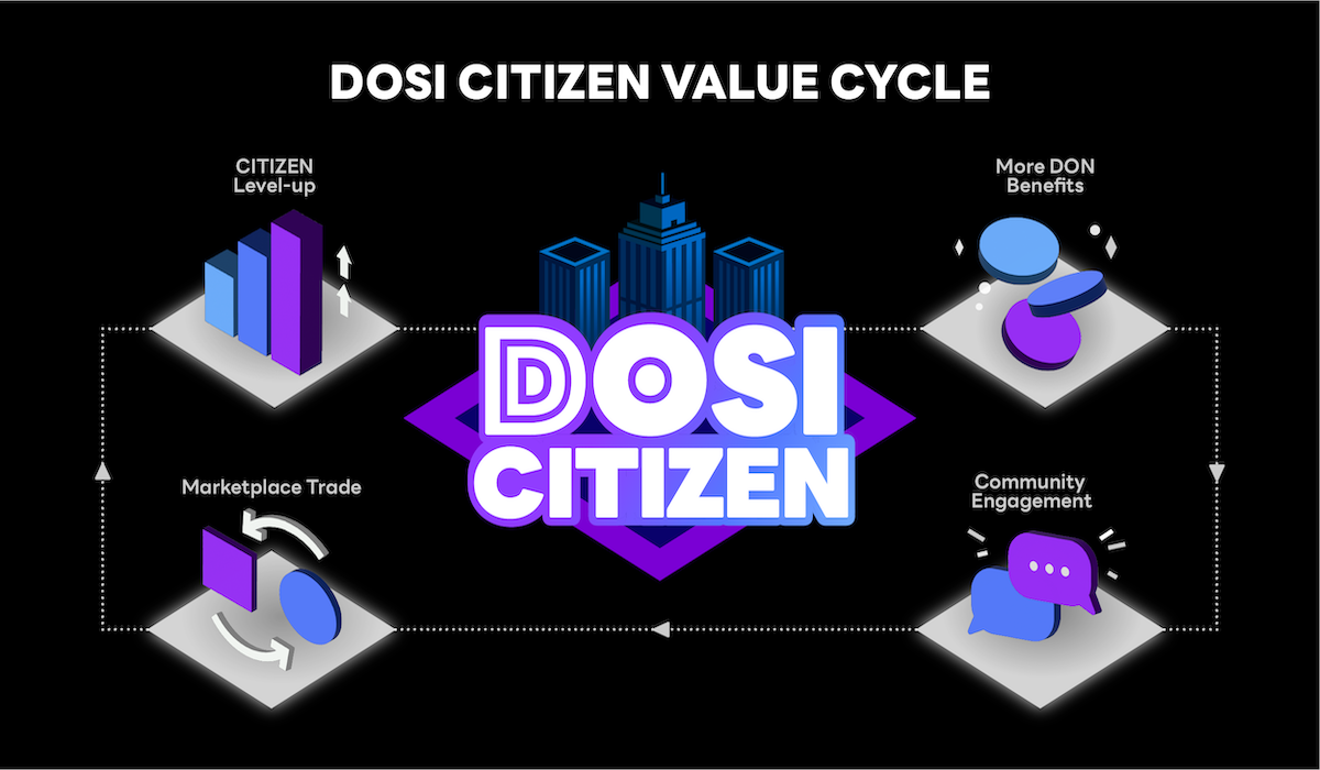 ユーザーは、NFT購入金額に応じて得られるメンバーシップポイント「DON」を使って「DOSI Citizen」をレベルアップさせることが可能です。「DOSI Citizen」のレベルが高いほどさらに多くの「DON」を獲得することができ、その数によってさまざまなNFT景品を獲得することが可能です。