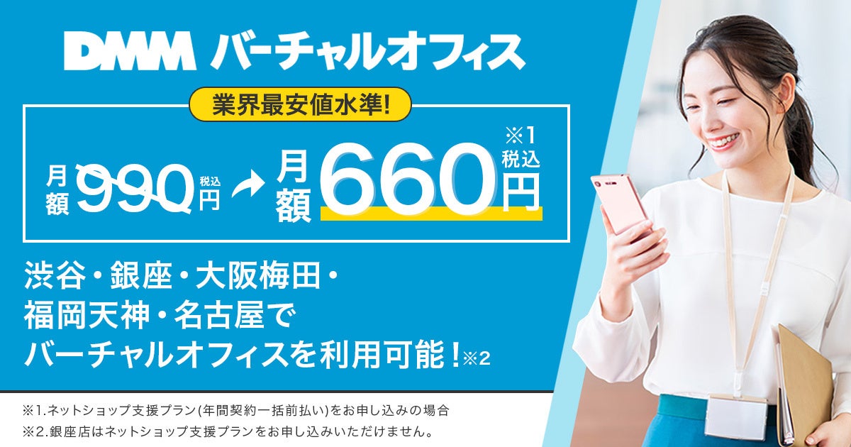 合同会社DMM.com(本社:東京都港区、会長 兼 CEO亀山敬司、https://dmm-corp.com/ 以下DMM )は、2022年11月17日(木)に、DMMバーチャルオフィス「ネットショップ支援プラン」を990円(税込)から、業界最安値水準の660円(税込)に値下げすることをお知らせいたします。