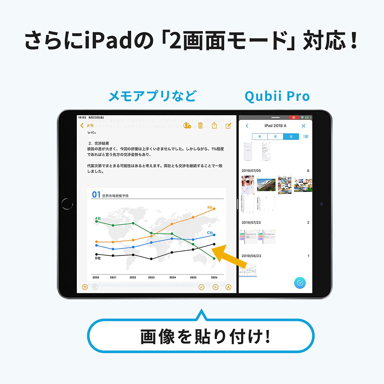 iPadの「2画面モード」でもっと便利に活用することができ、片方の画面で「Qubii Pro」アプリを開いておくことで、メールやメモアプリなどにデータを直接貼り付けできます。