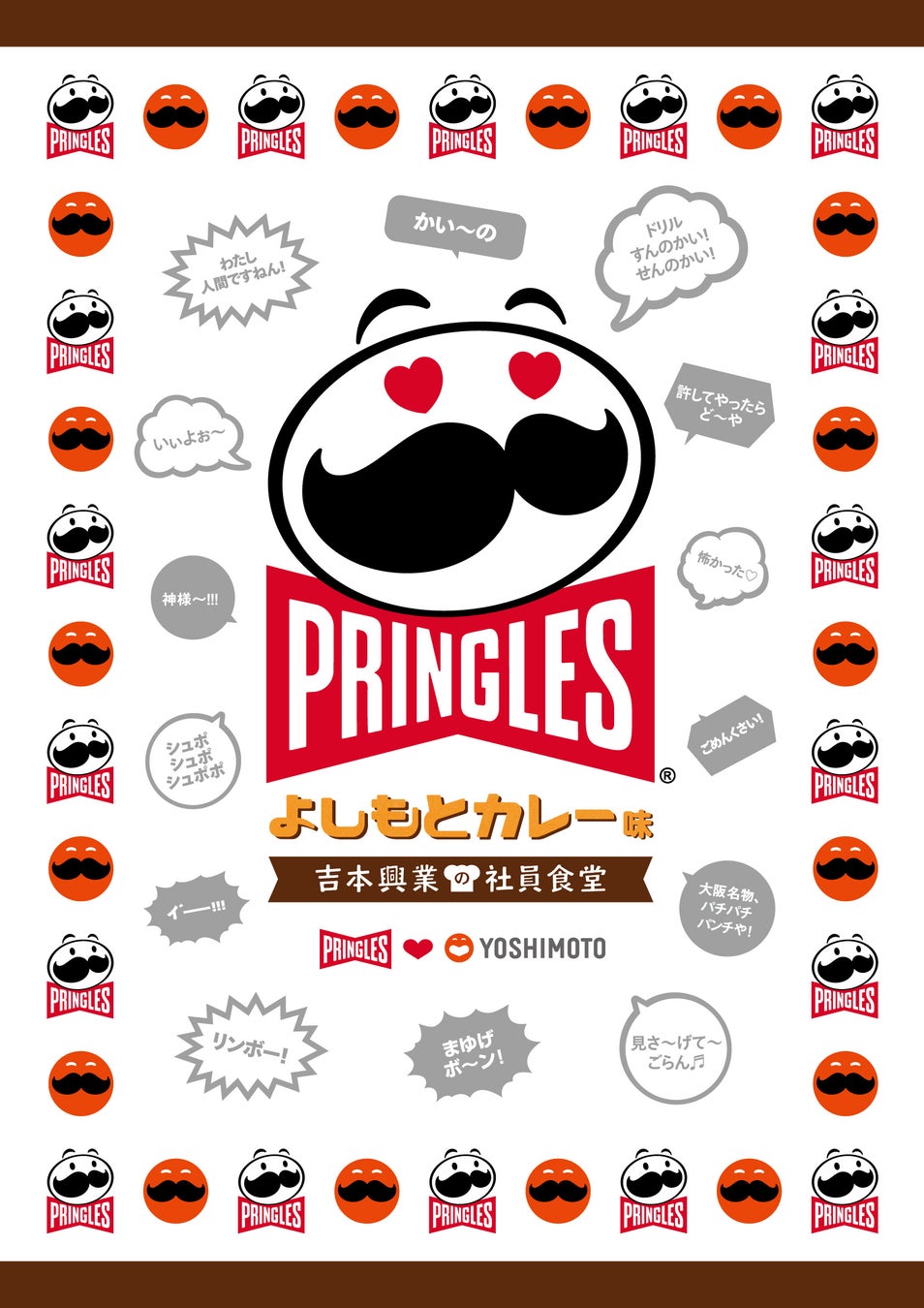 パッケージデザインは、プリングルズ×吉本興業らしく、楽しさ溢れるデザインになっています。商品を手に取ったお客様に味わいだけでなく、知っているギャグを見つけて目でも楽しんでいただきたいという想いから、吉本新喜劇座員のギャグを14個ふんだんに散りばめました。さらには、吉本興業のシンボルマークがMr.Pとお揃いのおヒゲをつけ、しずるにはにっこりと笑うカレーライスを描くことで、よりコラボレーション感を演出しています。