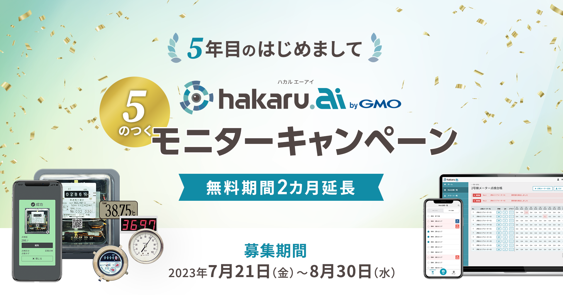 5周年を記念して、点検現場のDXの第一歩となるメーター値のデジタル化の仕組みを体験いただくため、法人向けに50社限定で、1カ月の通常トライアル期間に加えて、最大3カ月の無料利用が可能になる「5年目のはじめまして! 無料期間2カ月延長 hakaru.ai byGMO『5のつくモニターキャンペーン』」を2023年7月21日(金)より実施いたしました。