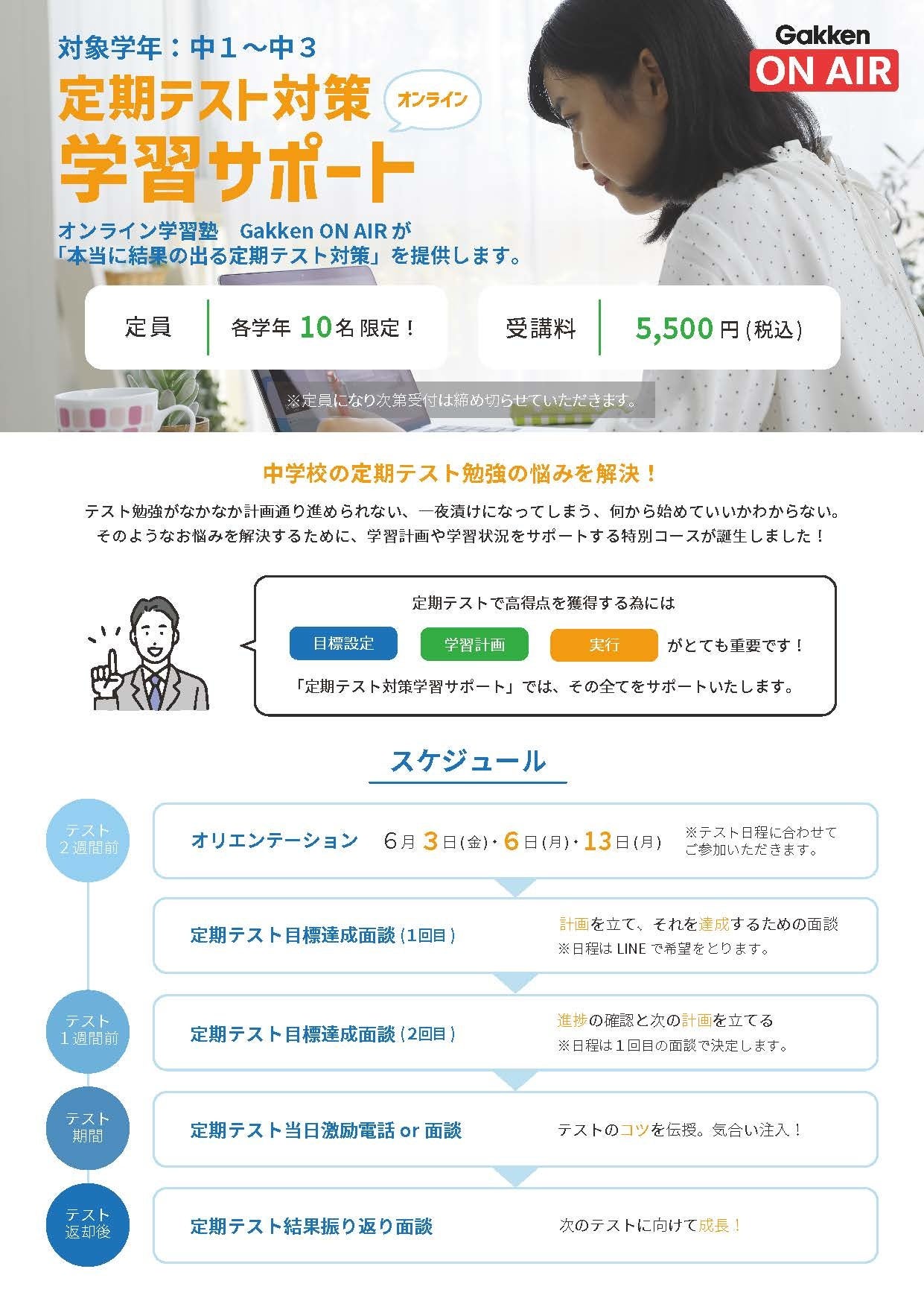 株式会社学研ホールディングス(東京・品川区/代表取締役社長:宮原博昭)のグループ会社、株式会社学研メソッド(東京・品川区/代表取締役社長:山下徹二)のGakken ON AIR(学研オンエア)が、5月19日より、「定期テスト対策オンライン学習サポート」の申し込みを始めました。