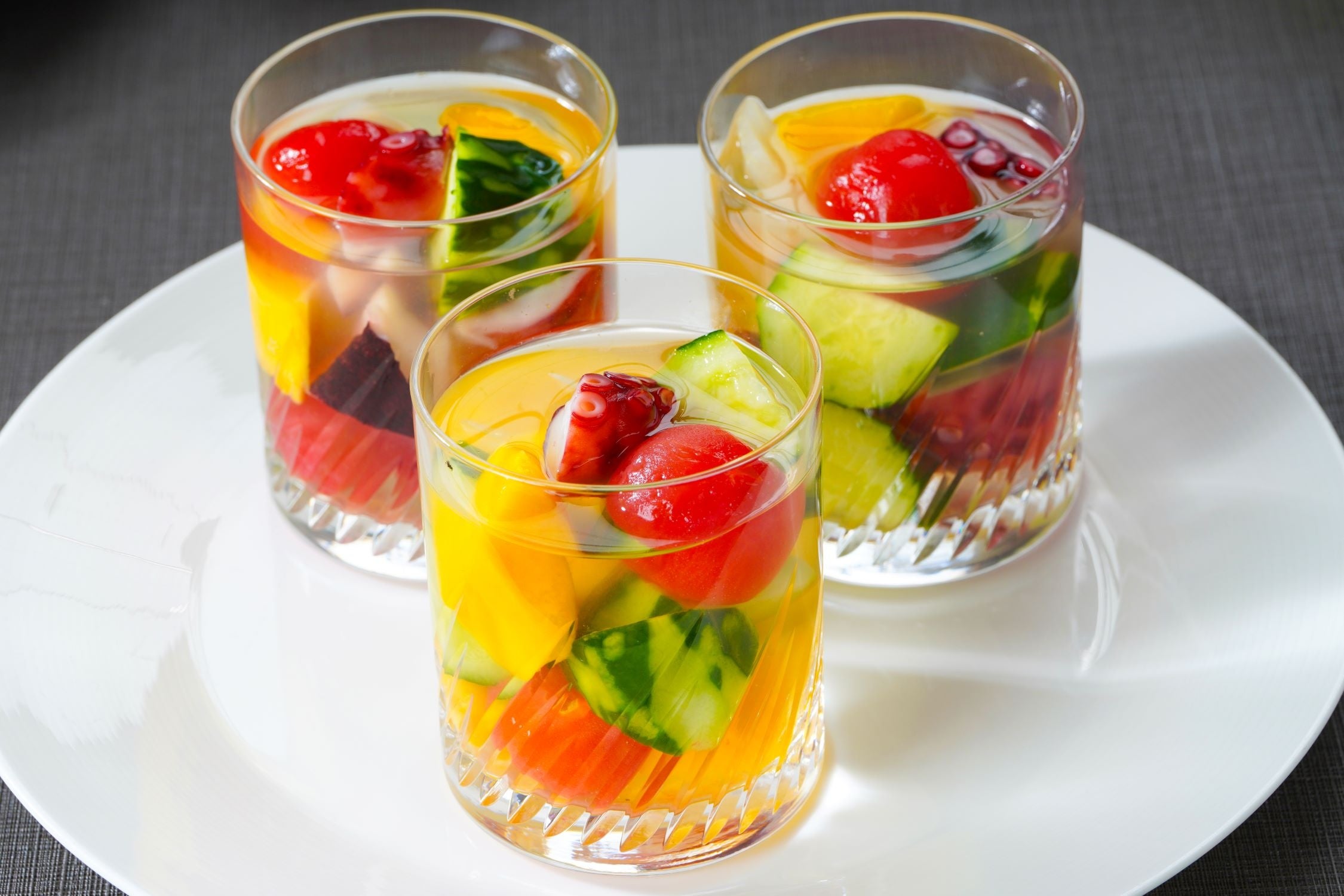 「メロンのショートケーキ」や「マンゴーのブランマンジェ」など、夏らしいスイーツもご用意。お食事の締めくくりまでお楽しみいただけます。