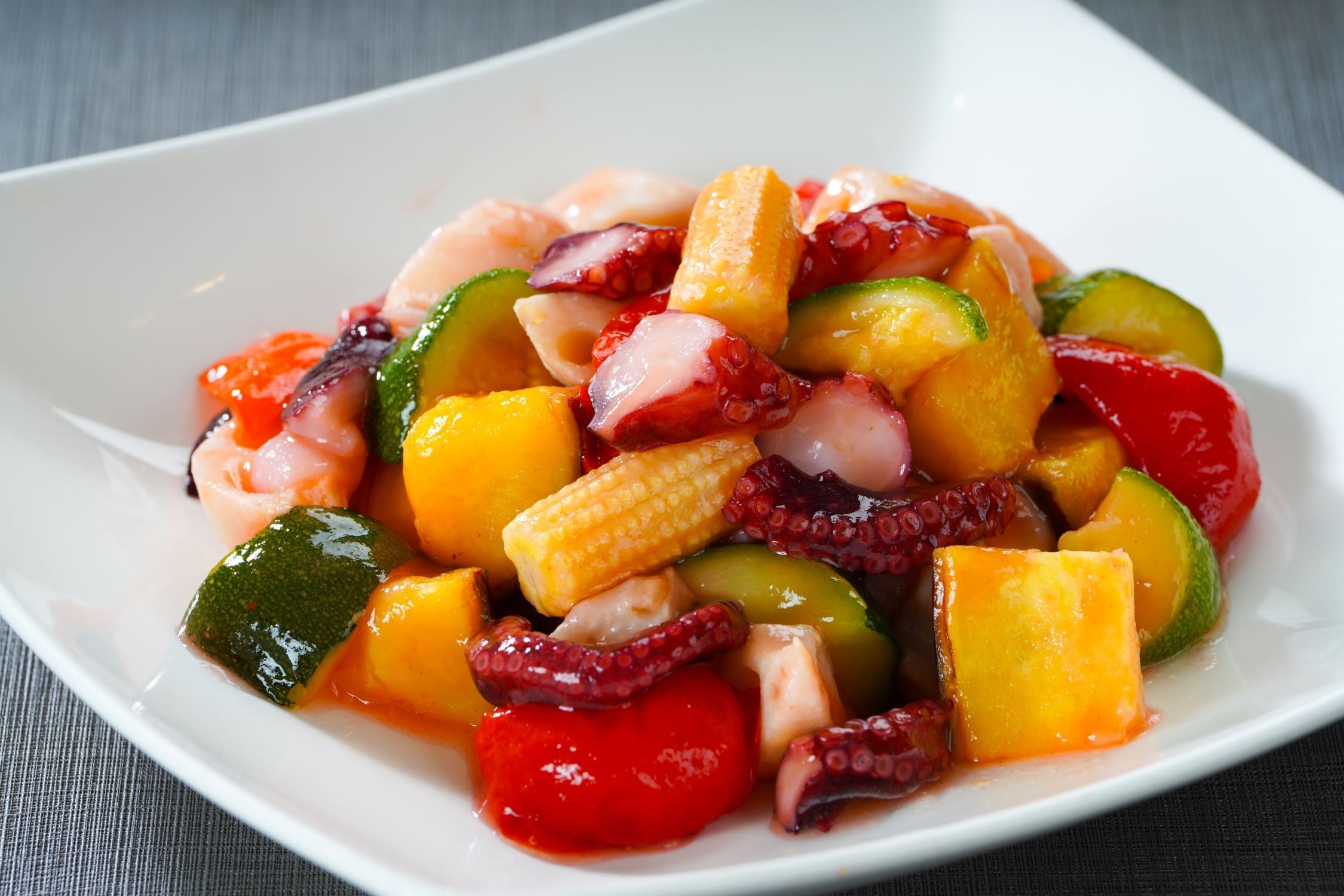 ・鶏唐揚げ 辛味スパイス ・ゴロゴロ野菜とタコの梅酢和え ・はす芋のごまだれかけ