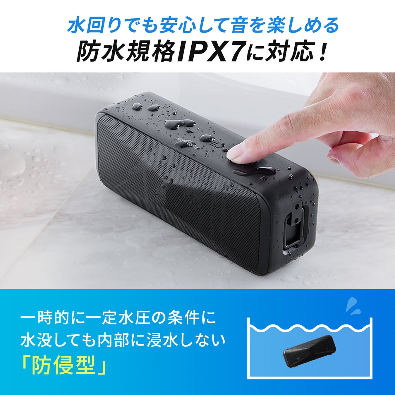本製品は、水のかかる場所でも使用できる、防水規格IPX7に対応したBluetoothスピーカーです。キッチンやお風呂、アウトドアなどで音楽を楽しめます。