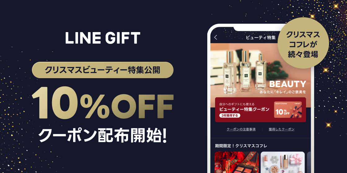 特集内に掲載されているコスメブランドの商品やクリスマスコフレ、LINEギフト限定セットを購入する際に使用できる「ビューティー特集10%OFFクーポン」も本日より配布を開始しています。友だちへのギフトだけでなく、自分宛のギフトにも適用できるため、1年間頑張った自分へのご褒美にも利用できます。