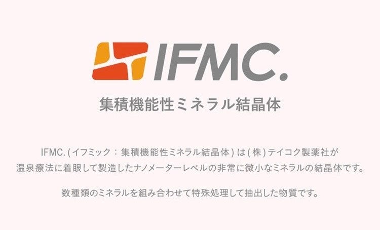 株式会社テイコク製薬社が温泉療法に着想を得て開発した、ナノメートルレベルの微細なミネラル結晶体です 。IFMC.(イフミック)には血中一酸化窒素と関係性があるという学術研究があり特許(第6557442号)を取得しています。一酸化窒素(NO)は、血管拡張作用を通じて血流調節に関与するほか、血管機能の維持に重要な役割を果たすことが知られており、世界中の医療や健康の分野で注目を集めています。