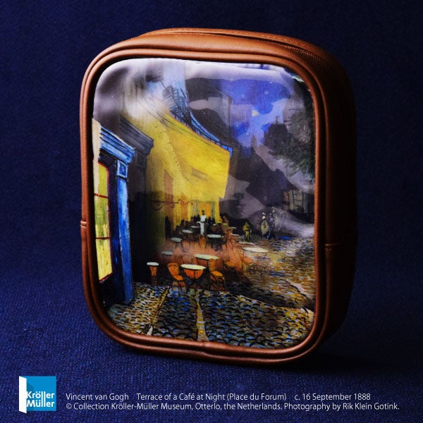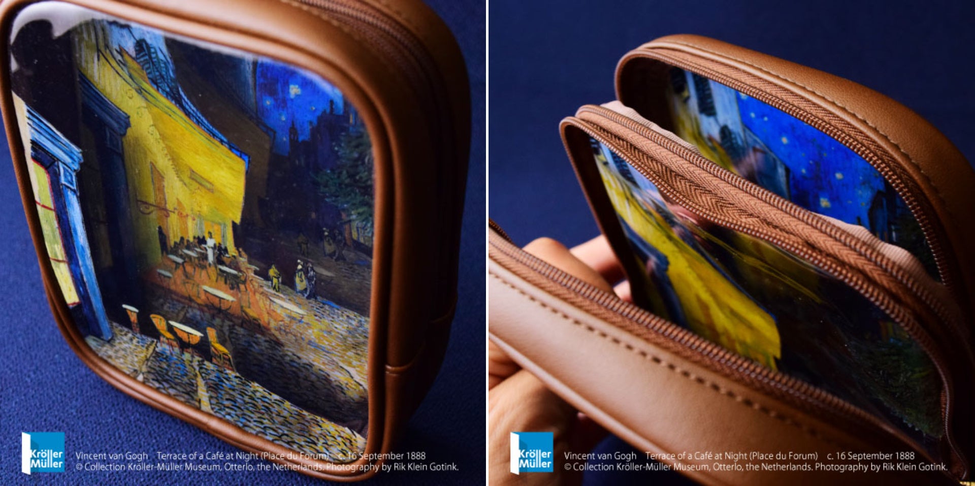 《夜のカフェテラス》を、3層のレイヤーに分けてプリントしたポーチ。手前のテーブル席、軒下のガス灯で黄色く輝くカフェテラス、奥につづく街並みと夜空……作品世界の奥行きを、より感じていただけるグッズです。