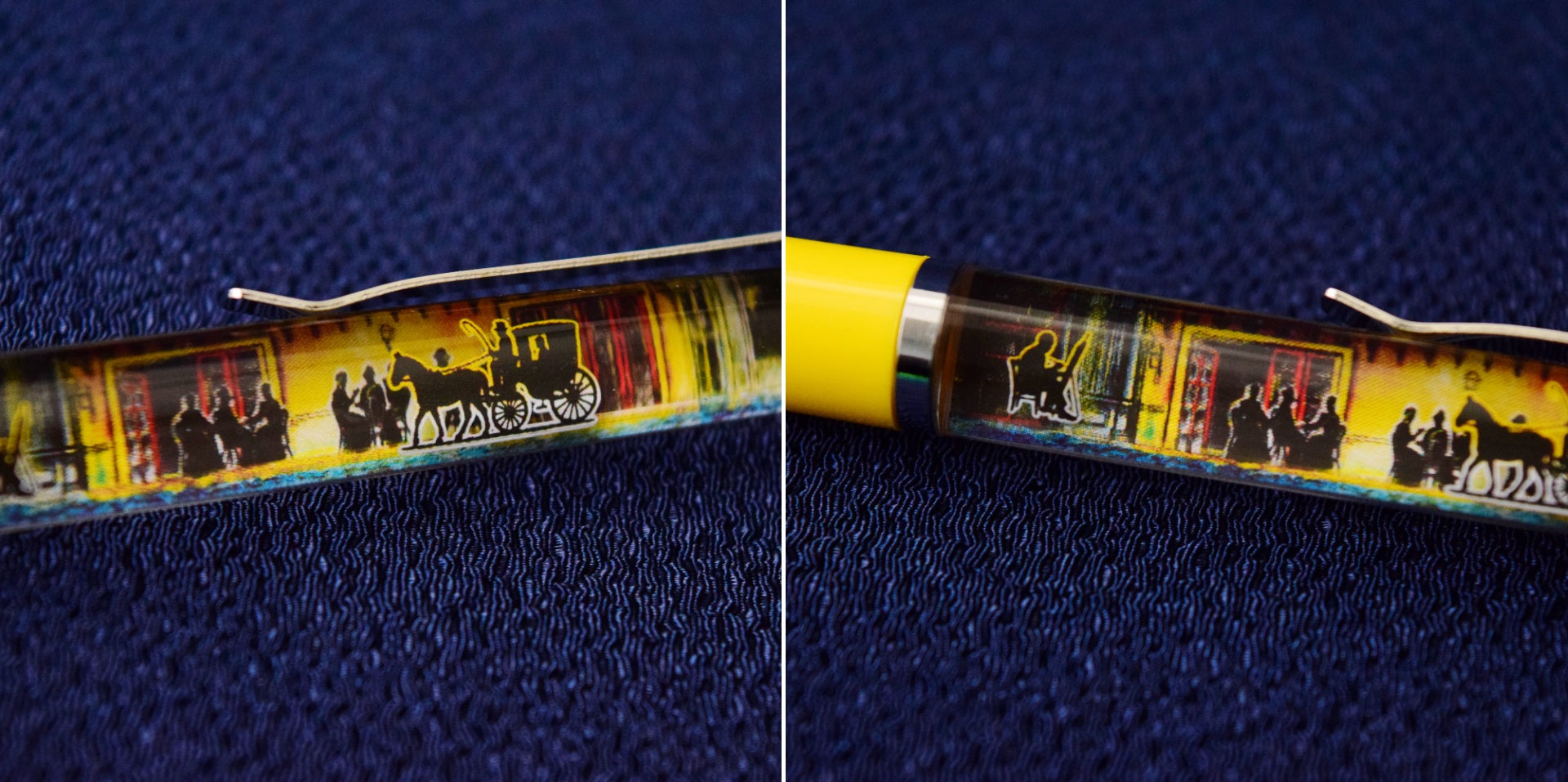 《夜のカフェテラス》の作品中央、カフェテラスの奥から走ってくる馬車をモチーフにしたフローティングペンです。ペンを動かすと馬車が動きます。作品世界をイメージして書き起こしたイラストの中には、《夜のカフェテラス》を描くファン・ゴッホの姿も。