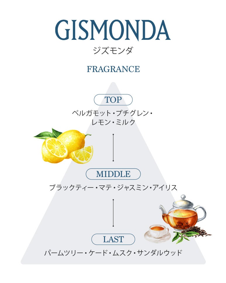 ベルガモットやレモンの軽やかなシトラスにミルクのまろやかさを重ねたトップから始まり、ブラックティーやマテの温かみのあるティーノートに、ジャスミンやアイリスの華やかさが重なります。ラストはスモーキーなウッドとムスクが奥行きのある余韻を残す、深みと気品を感じるスモーキーティーウッディの香りです。