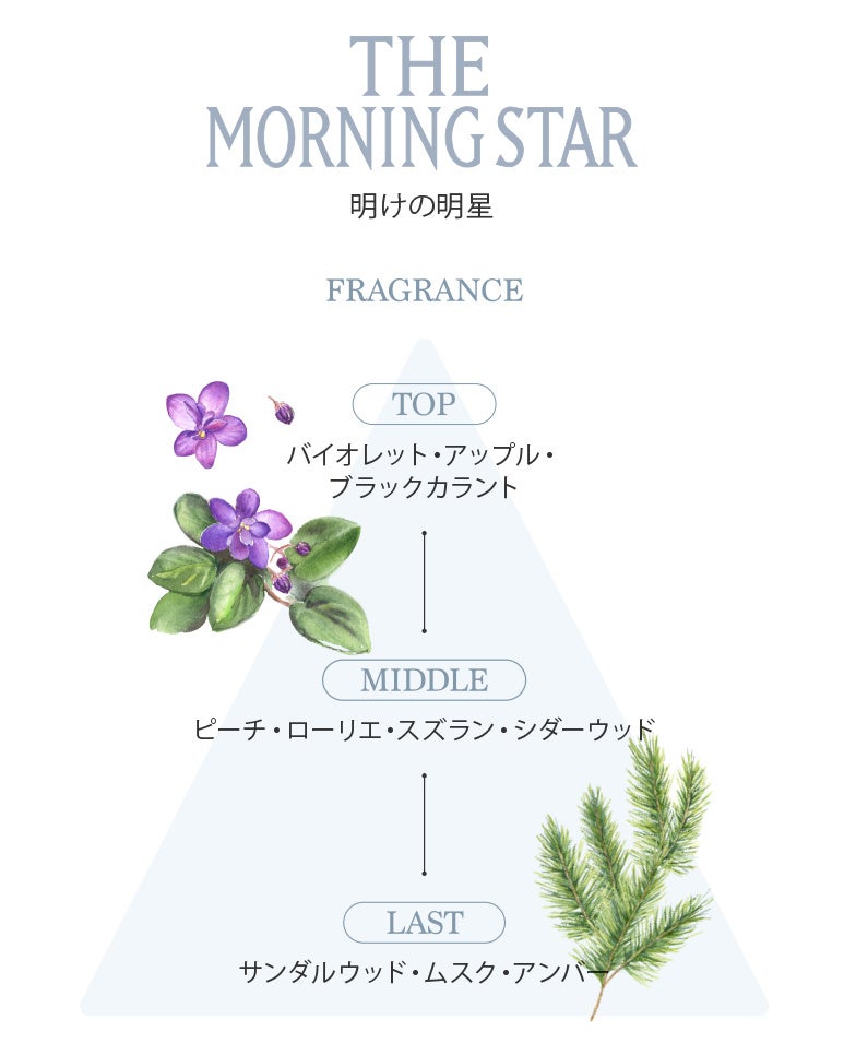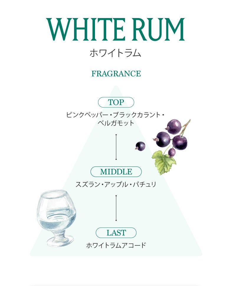 アップルやブラックカラントのみずみずしい果実の香りから始まり、ピーチやスズランがやわらかな甘さと透明感を添え、月桂樹やシダーウッドの爽やかなグリーンノートへと移ろいます。ラストはサンダルウッドやアンバーが穏やかな温もりを残す、軽やかで清潔感のあるフルーティフローラルグリーンの香りです。