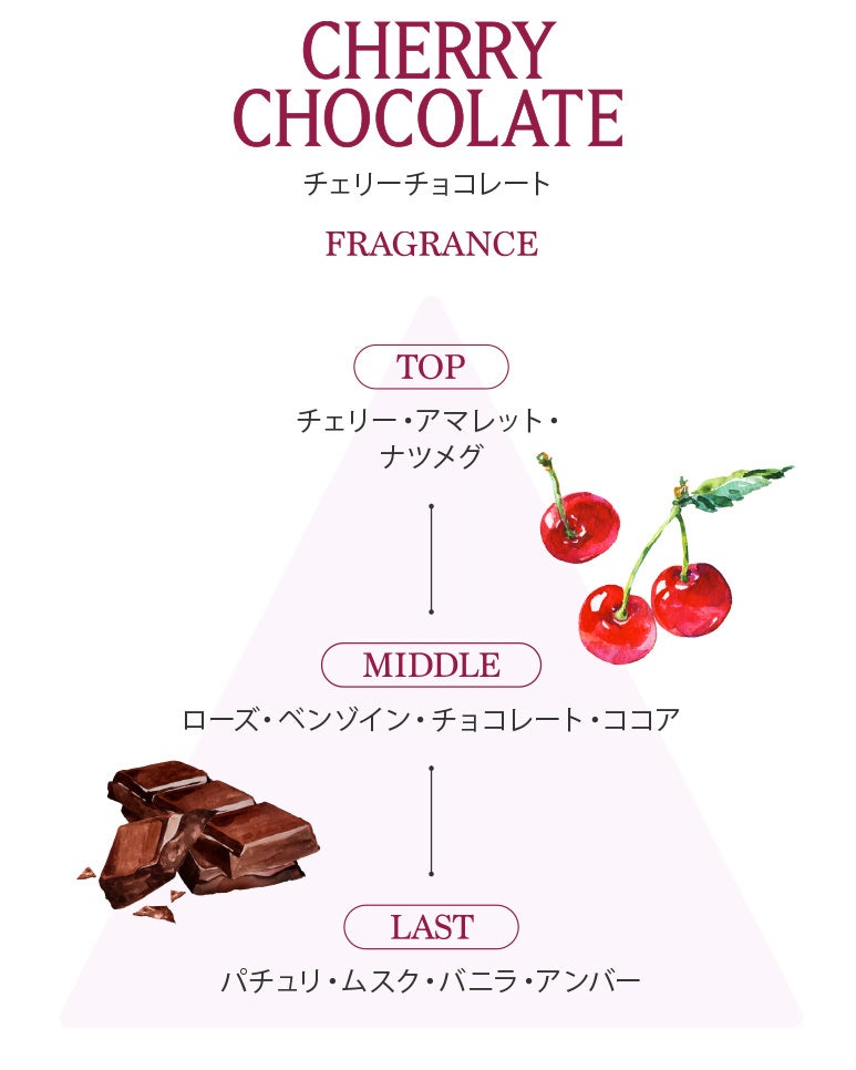 チェリーとアマレットの甘くジューシーなトップにナツメグのスパイスを効かせ、ローズの華やかさにチョコレートやベンゾインの濃厚な甘さが重なります。ラストはパチュリやムスク、アンバーが奥行きのある余韻を残す、ビターな甘さと深みを感じるチェリーチョコレートの香りです。