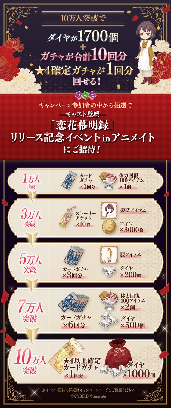 キャンペーンでは事前登録者数に応じて最大でダイヤ1700個やカードガチャ10回分アイテム、★4確定カードガチャ1回分アイテムなど豪華アイテムがもらえるキャンペーンとなります。さらに、アニメイトゲームスでの事前登録者限定で、アニメイトでのお買い物に使える300アニメイトポイントをプレゼントするほか、応募者の中から抽選で「リリース記念イベント」へご招待します。
