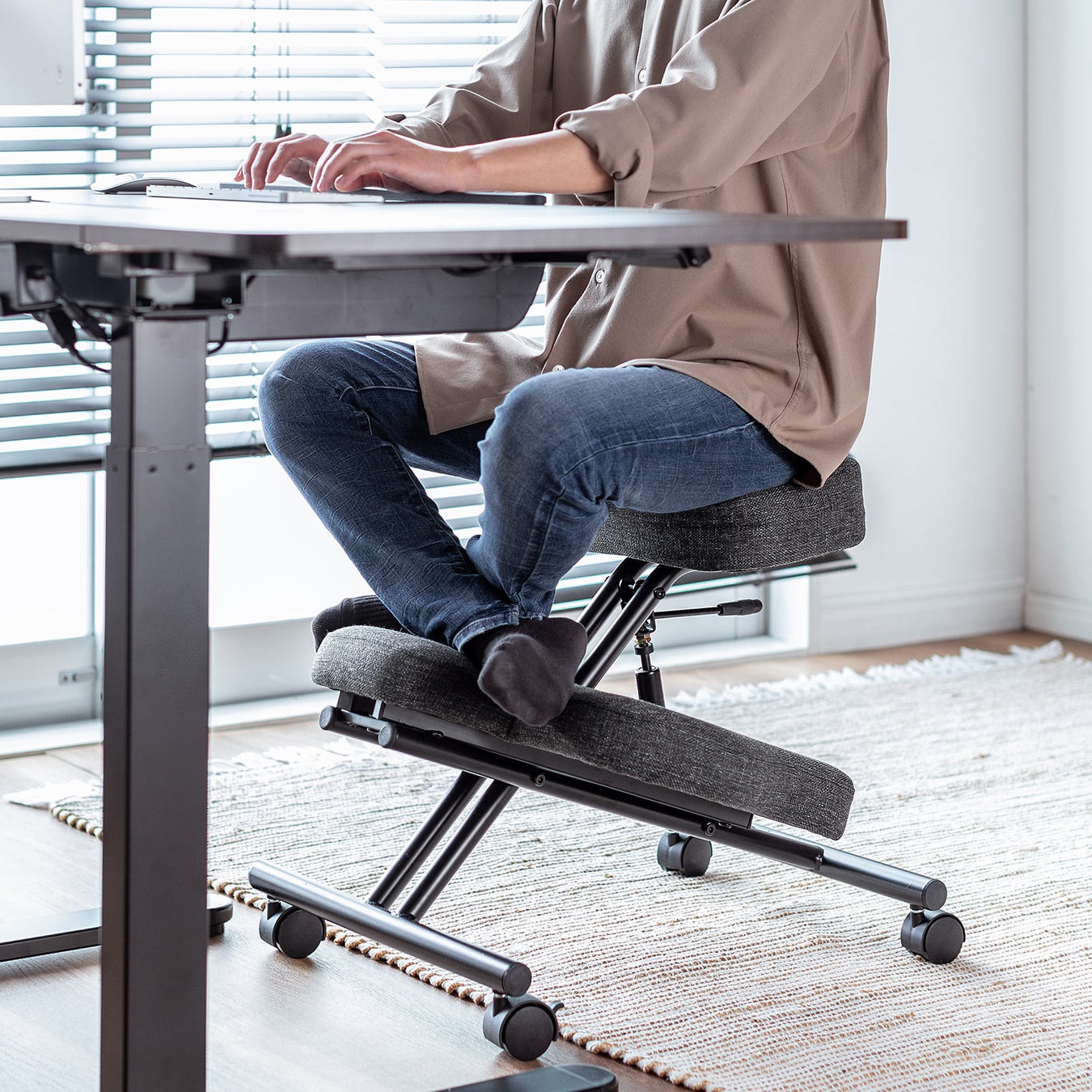 ガス圧式で高さ調整することで、座面の角度が変化できます。座面を低くすることで、角度が緩やかなので、リラックスして座ることができます。座面を高くすることで、前傾姿勢になり、骨盤を立てて良い姿勢を保つことができます。