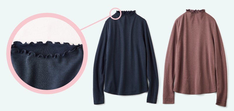 お出かけ中も含め、デイリーユースができるデザインにも徹底的にこだわっています。トップスの首もとは、ボトルネックでしっかりと首もとを多い、衿先をメロウ仕上げにすることで、ファッション性と機能性を両立させたオリジナルのデザインに仕上げました。アウターやワンピースなどの下に重ね着可能なベーシックカラーです。おうちでのリラックスタイムだけでなく、お出かけ時には重ね着のインナーとしても着用できるので、シーンを選ばず、着ている間はいつでもからだを労わりながら過ごすことができます。