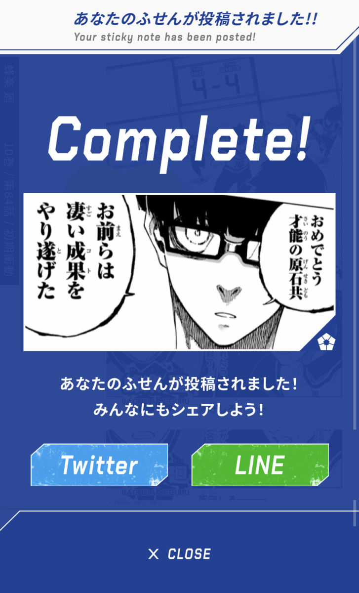 主要7キャラクターにフォーカスした各3話分・計21話について、〝ふせん〟を貼って推しキャラクターに投票しよう!4月16日までのふせん投稿期間中、最も多くのふせんを集めたキャラクターの特別描き下ろしカラーイラスト が「週刊少年マガジン」本誌で掲載!(※掲載号未定。『ブルーロック』作品公式Twitterアカウント@BLUELOCK_WMで発表予定。)