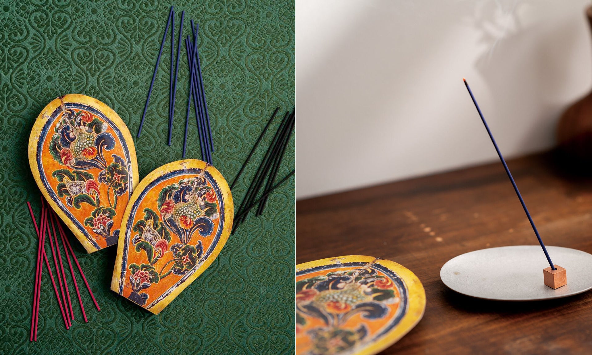 極彩色の蓮弁が仏像の台座のように組み合わされた宝物「漆金薄絵盤(うるしきんぱくえのばん)」のデザインをオリジナルパッケージで楽しめるお香です。香を焚く「台」として法要で用いられていた漆金薄絵盤をそのままモチーフにしているので、特別感もひとしお。