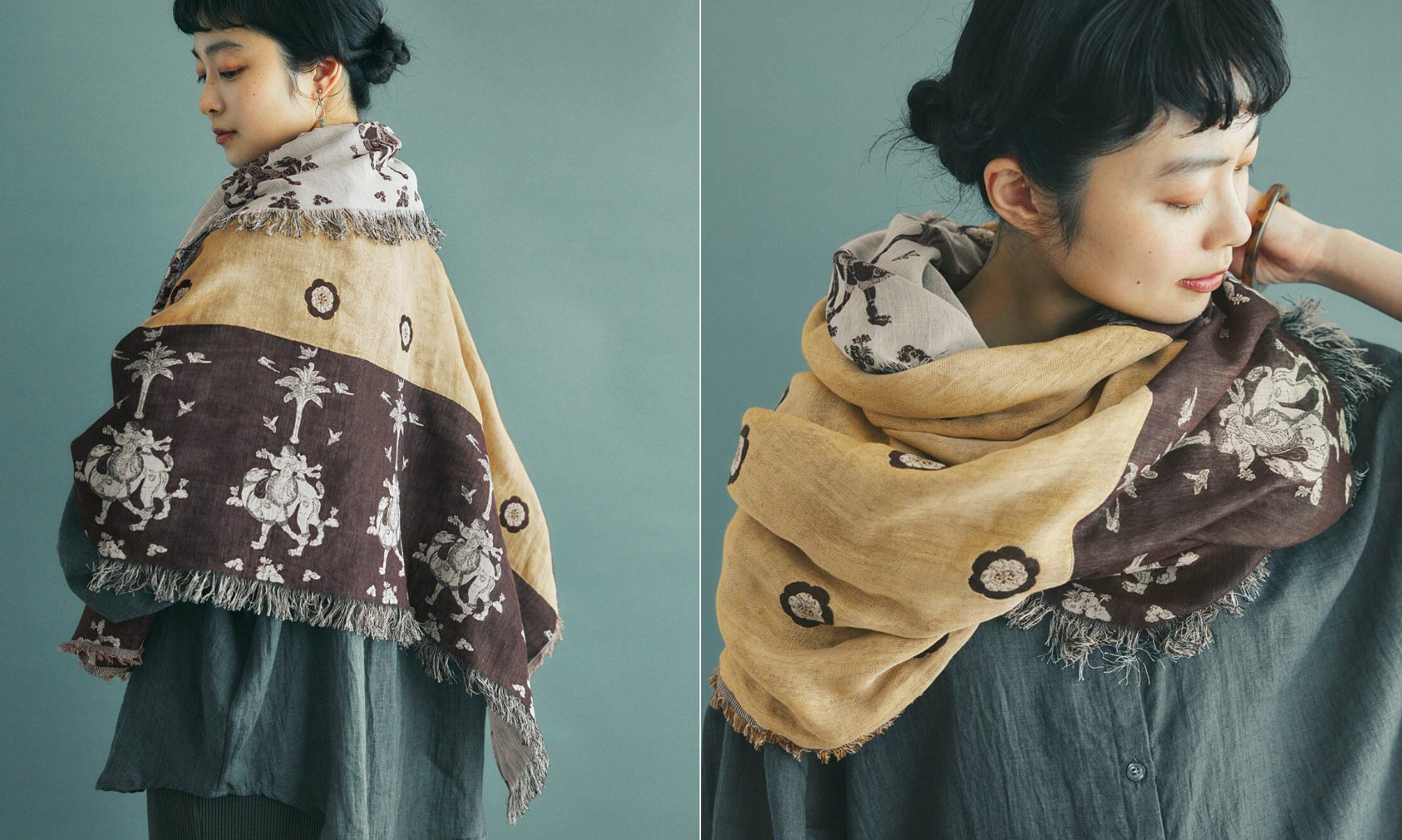 正倉院宝物で人気の工芸品「螺鈿紫檀五絃琵琶(らでんしたんのごげんびわ)」に描かれている小花や胡人たちがあしらわれている大判のストールです。播州織の職人によって一本一本紡がれた繊細な模様は、正倉院のロマンあふれる上質な華やかさが感じられます。異国情緒あふれる雰囲気も素敵です。落ち着きのある色合いは、さっと羽織るだけでどんなスタイルにもよく合います。
