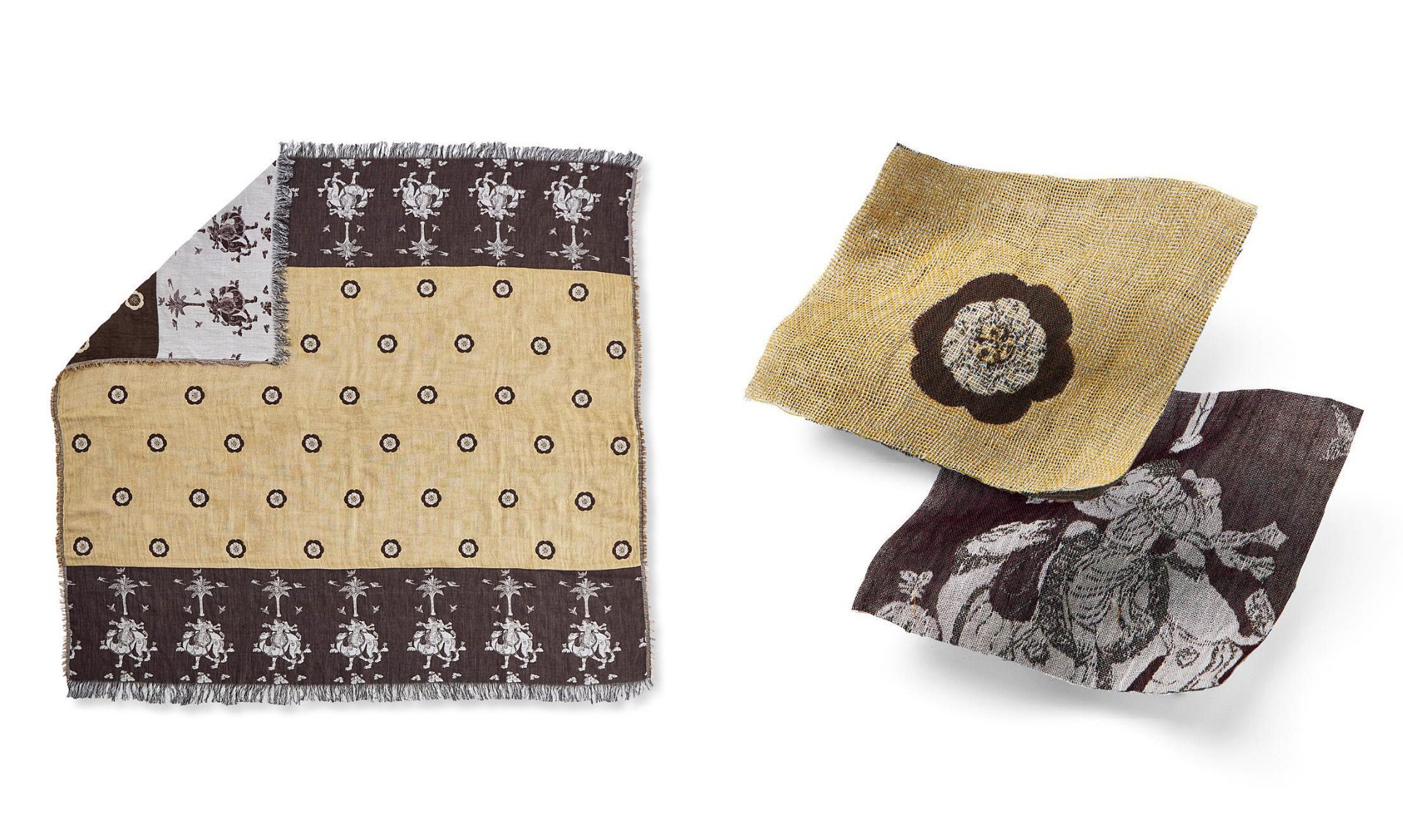 繊細な図案をジャカード織りで表現。色の重なりや、裏と表で変わる風合いを楽しめます。首まわりに多くふれる中央部分には太めの糸を2層や4層で織り上げ、軽やかでふんわりした仕上がりに。