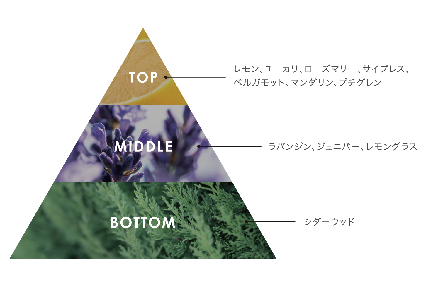 レモン、ユーカリ、ローズマリー、ベルガモット、カモミールなど13種の精油をブレンドした