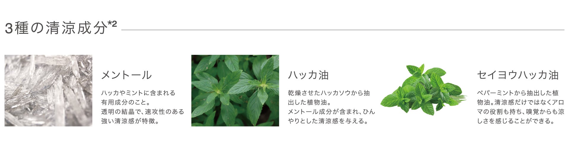 *2メントール、ハッカ油、セイヨウハッカ油(すべて清涼成分)