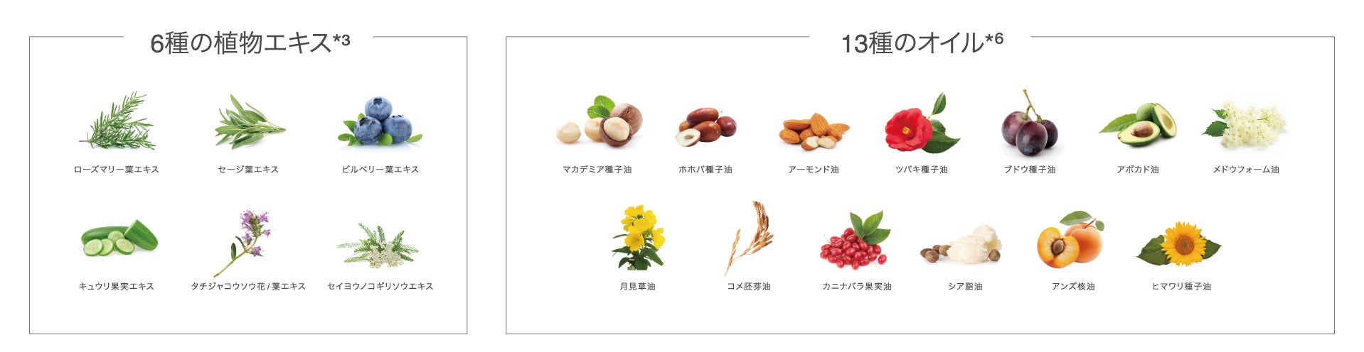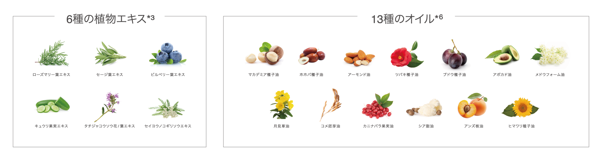 ローズマリー、セージ、ビルベリーなどの6種の植物エキス*³と、ホホバオイル、米ぬか、シアバターなど13種*⁶のオイルを厳選配合。
