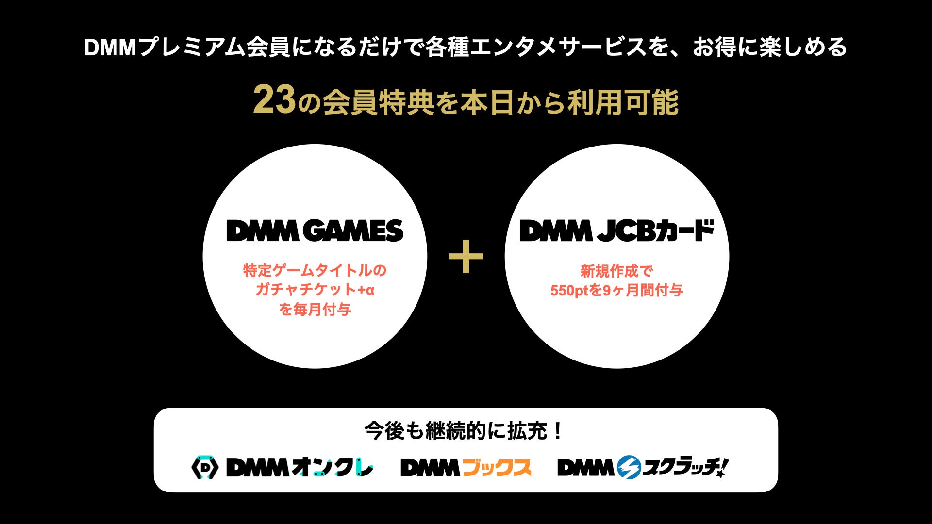 「DMMプレミアム会員」になることで、「DMM TV」を含め、アニメ、マンガ、ゲーム、グッズ購入、オンラインくじやオンラインクレーンゲームといったDMMの各種エンタメコンテンツを、ジャンル横断でよりお得に楽しむことができます。また、「DMM GAMES」や「DMM JCBカード」等のサービス特典や、外部アライアンス企業と連携した特典など、充実した特典を提供いたします。本日から23の会員特典をご利用いただくことができ、今後も随時拡充してまいります。