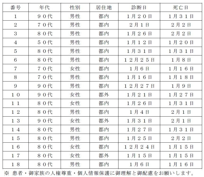 都内で新型コロナウイルスに感染した方が死亡されましたのでお知らせします。