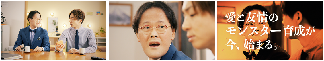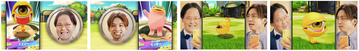 本番前の楽屋をイメージした撮影現場に衣装のスーツ姿で登場した稲田さんと河井さん。スマートフォンを手に真剣にゲームの説明を聞くお二人でしたが、本番のシーンでは漫才のような息の合った掛け合いを見せ、順調に撮影が進行。「かわいいユッズー篇」の撮影では、河井さんの「お前からやったらどんなモンスターが生まれるんやろな?」というセリフに「そうやなぁ、こんな感じ?」と愛嬌たっぷりの変顔を連発する稲田さんを見て、河井さんが思わず吹き出してしまう場面も。また、インタビューでは「自分をモンスターに例えると何ですか?」という質問に稲田さんがすかさず「”保険証モンスター“ですかね(笑)」と自虐ネタで返し、河井さんや撮影現場を笑いの渦に。終始笑いあり、コンビ愛ありの和やかな撮影風景はメイキング&インタビュー映像で見ることができます。