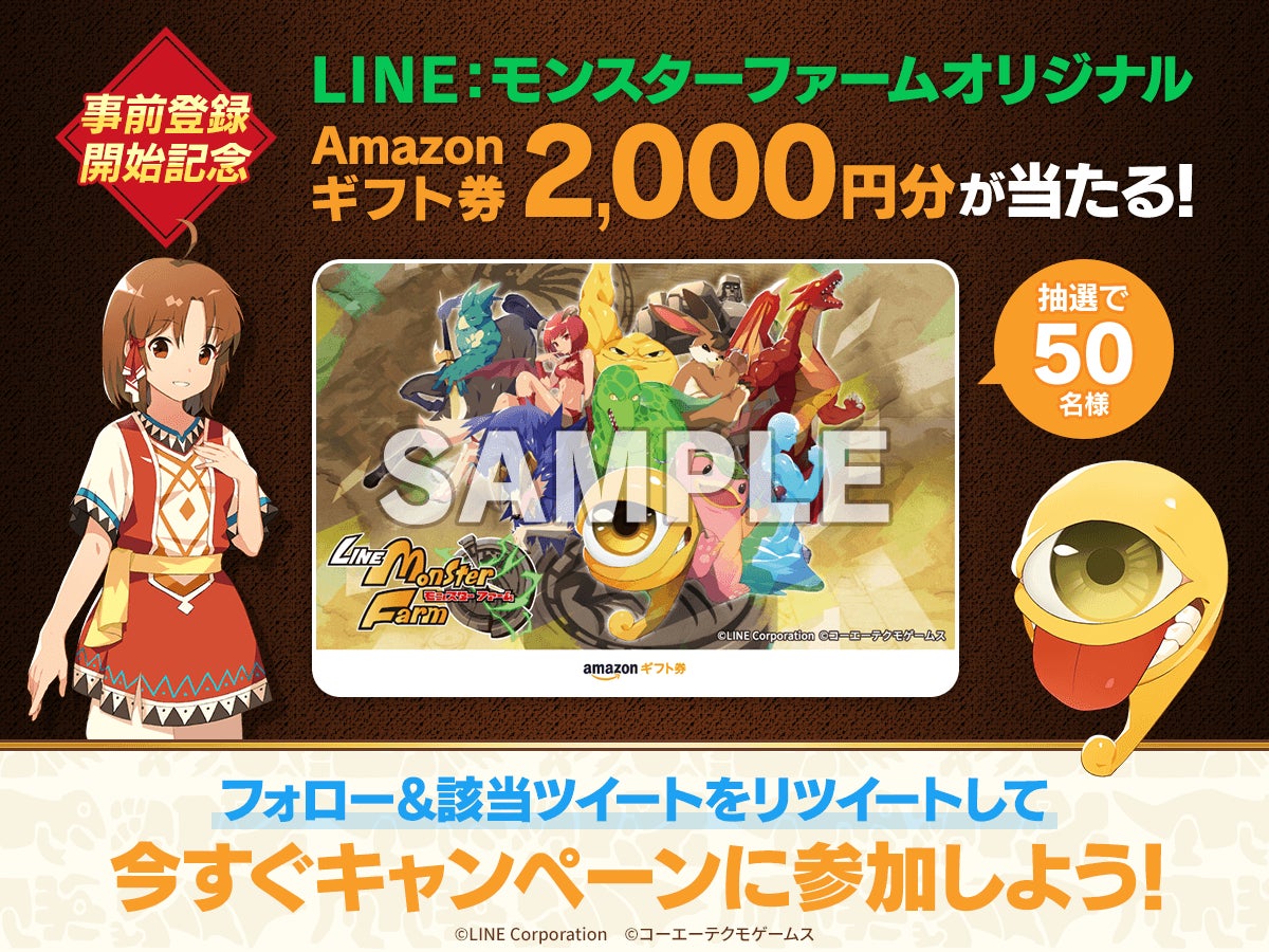 事前登録開始を記念して、「LINE:モンスターファーム」公式Twitter(@MonsterFarm_L)をフォローし、キャンペーンツイートをリツイートいただいた方の中から、抽選で50名様に「LINE:モンスターファーム」オリジナルデザインのAmazonギフトカードが当たるTwitterフォロー&リツイートキャンペーンを開催します。