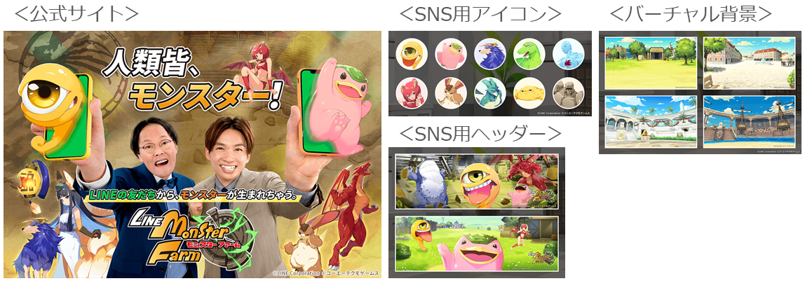 また、「LINE:モンスターファーム」の公式サイトも本日オープンいたしました。公式サイトでは、モンスターやゲーム内のイラストを使用したSNS用アイコン・ヘッダー、バーチャル背景の無料配布のほか、今回新たに制作したプロモーションムービーをご覧いただけます。