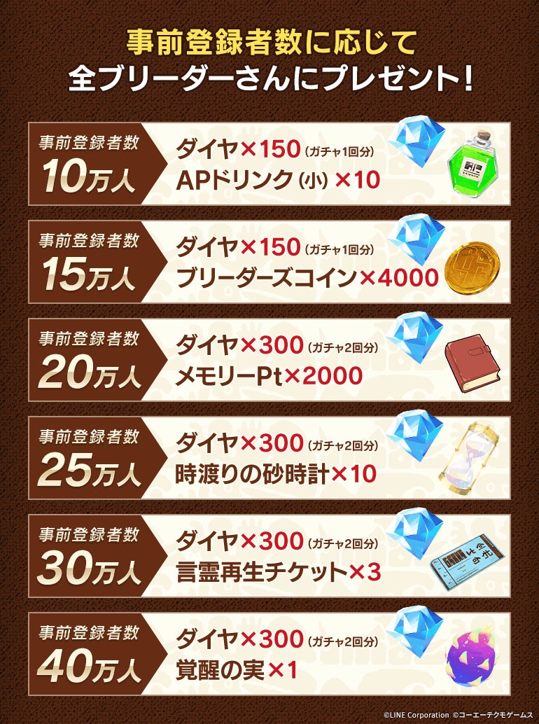 事前登録者数に応じて、ユーザー全員に以下のゲーム内アイテムをプレゼント