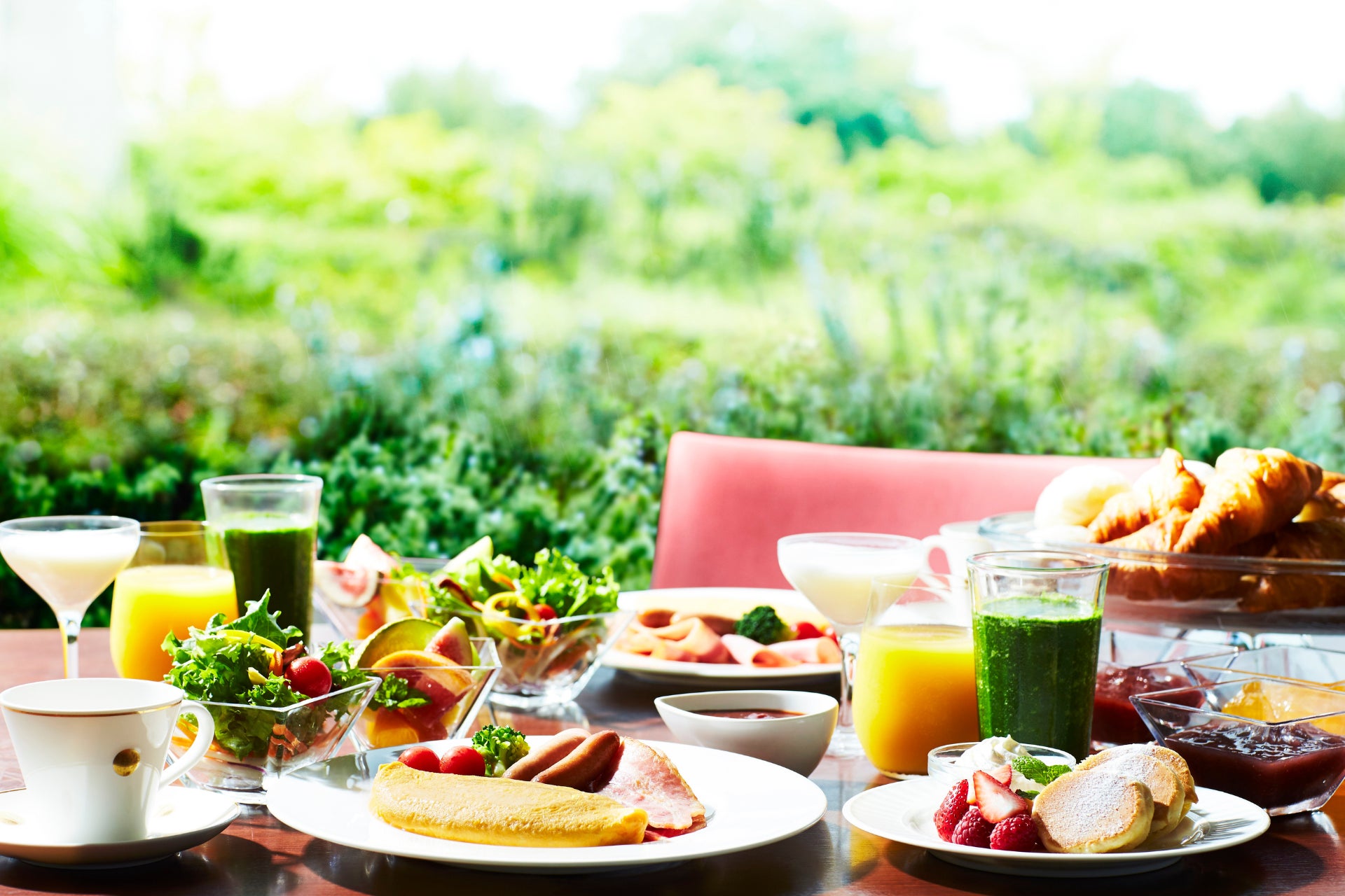 本プランでは、窓の外の景色に溶け込むような安らぎの空間が広がるデラックスルームまたはラグジュアリールームからお選びいただけます。また、やわらかな陽光に包まれて迎える翌朝には、淡路産の食材をふんだんに取り入れたブッフェをご用意しております。淡路産玉ねぎやしらす、トマトなどお好みの具材を合わせて目の前で焼き上げる、淡路放し飼いたまごのオムレツをはじめ、カラフルな人参やレタスなど地元で採れる野菜のサラダ、芳醇なバターの香りが広がるクロワッサン、淡路島牛乳のヨーグルトなど、島の恵みを活かしたメニューを心ゆくまでお楽しみいただけます。
