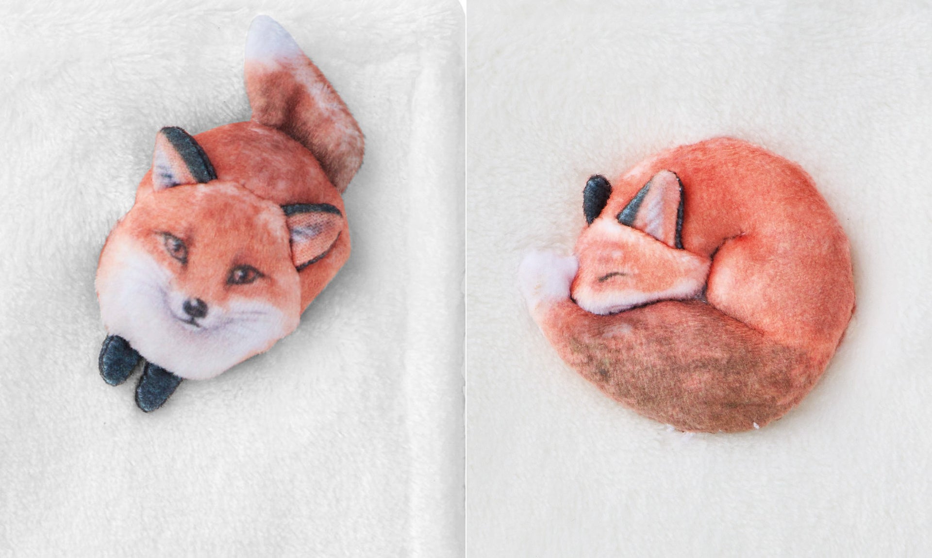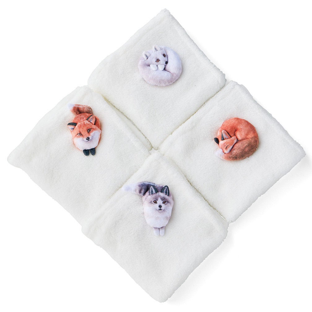 デザインは〈キタキツネ おすわり〉〈ホッキョクギツネ〉〈キタキツネ おやすみ〉〈プラチナキツネ〉の4種類。リアルなイラストのプリントに、ステッチを入れて立体的に表現されています