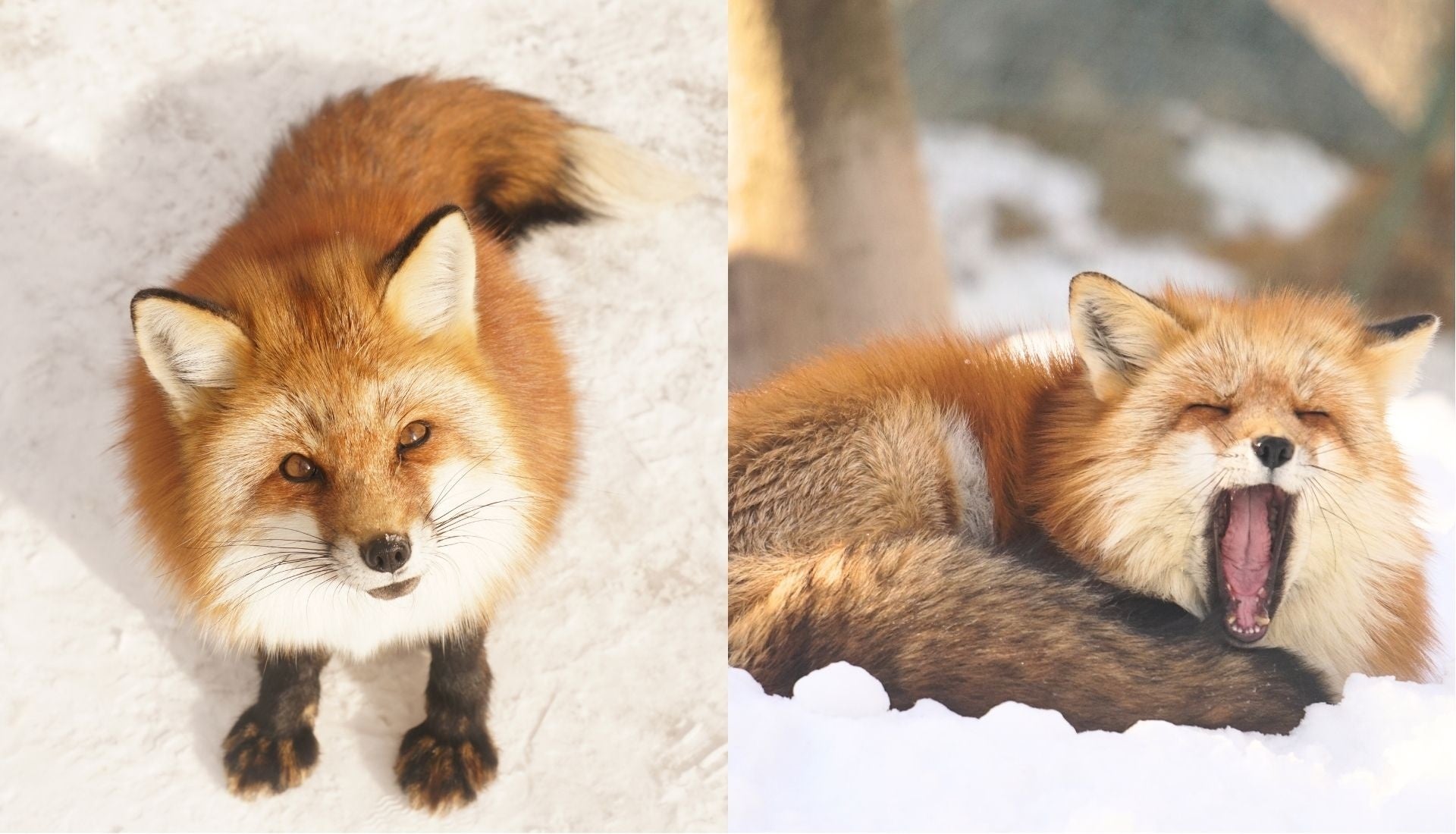 雪の上でこちらを見上げている姿、しっぽを枕にして眠る姿を再現しています。