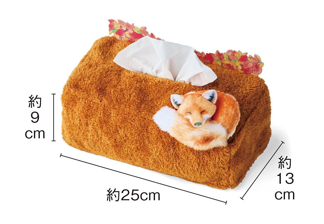 宮城蔵王キツネ村の飼育員さん監修のもと、紅葉の季節を満喫するキツネの姿が再現されたティッシュカバーです。キツネ村でもよく見られるというしっぽを枕にして眠る姿をおうちでも眺めることができます。
