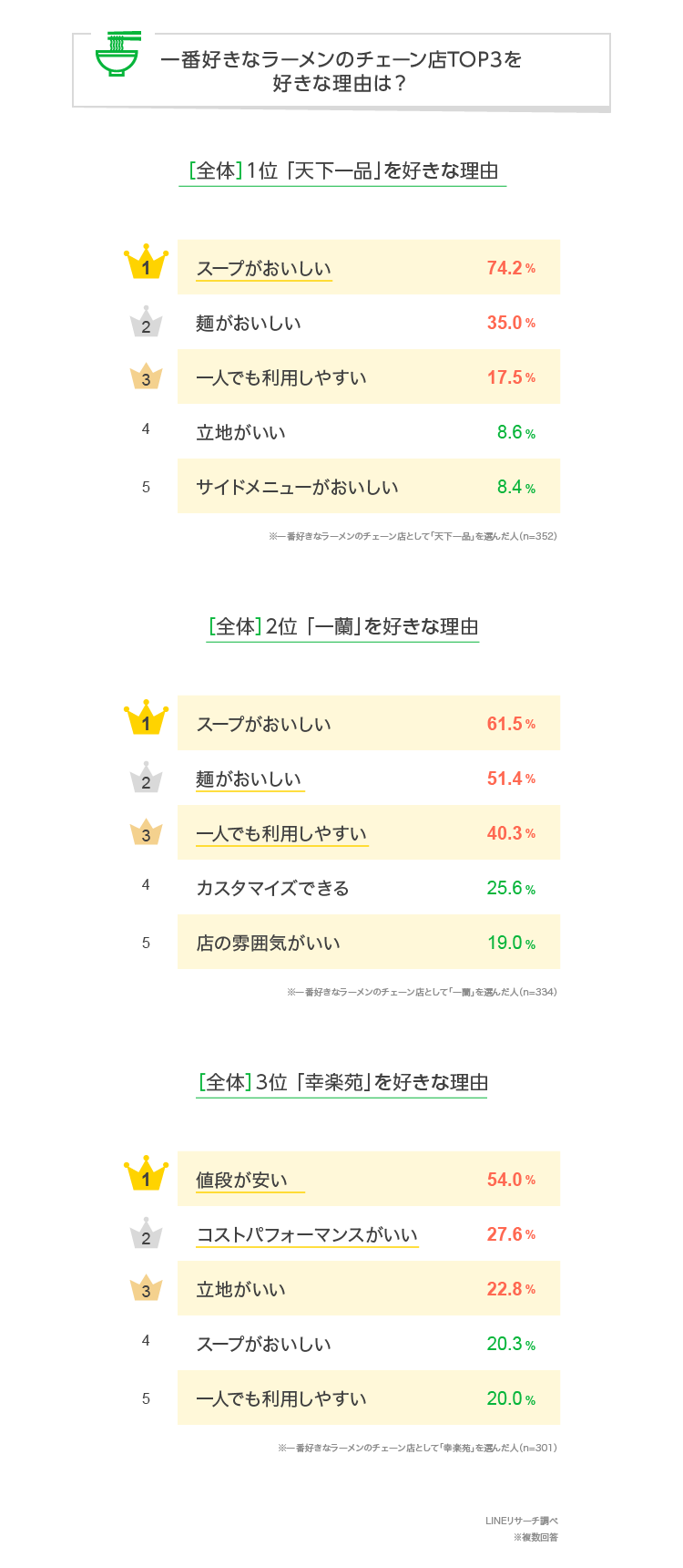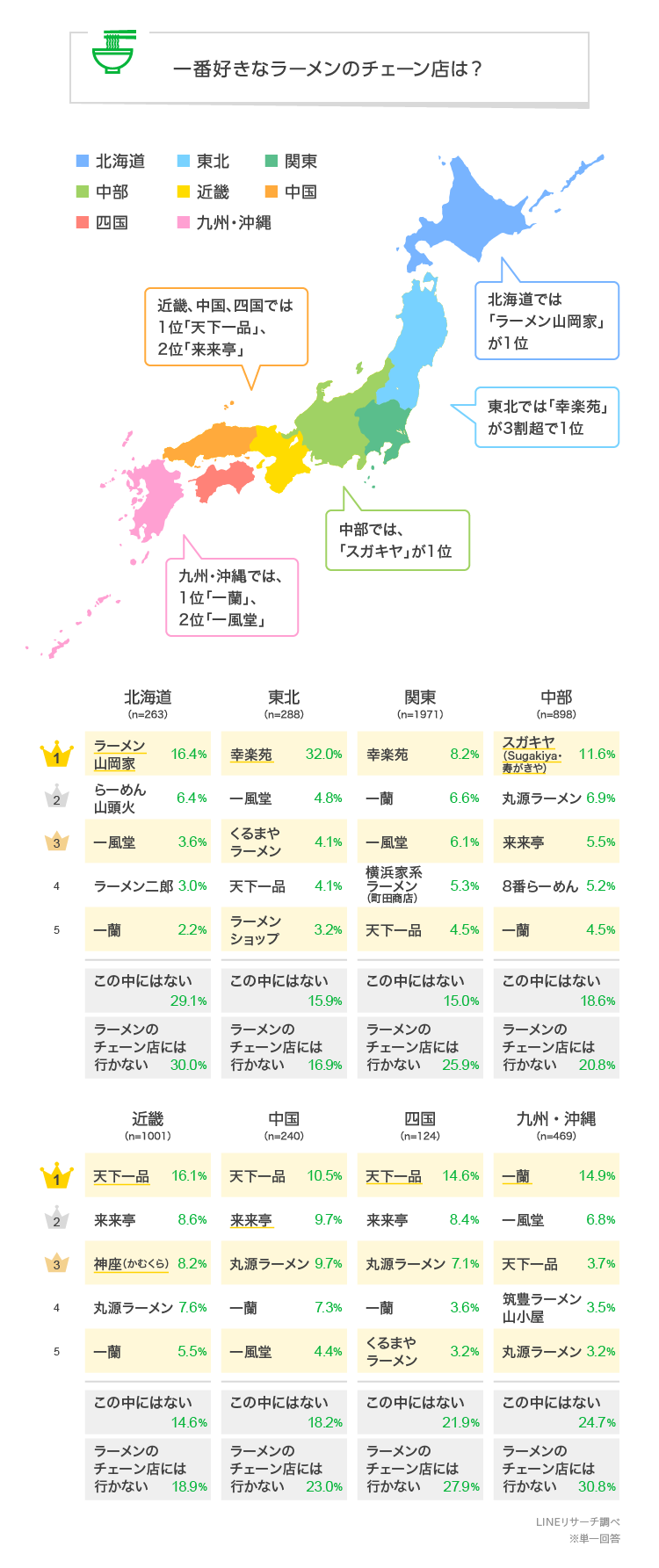 このたびLINEリサーチでは、日本全国の男女を対象に、好きなラーメンのチェーン店やそのお店が好きな理由について調査しましたので、その結果をお知らせいたします。