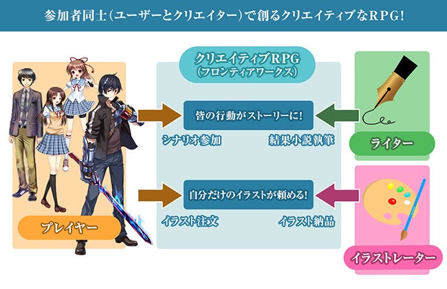 オリジナルキャラクターの【小説】や【イラスト】をクリエイターたちと一緒に作っていく、TRPGのような手作り風RPGです。