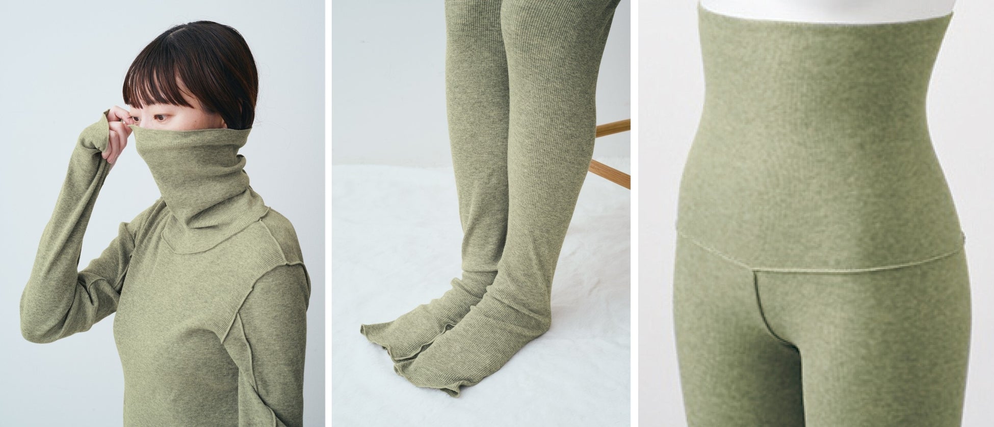 タートルネックは鼻先まで伸ばせて冷えを防止。親指ホール付き袖で手先まであたたかく、スマホ操作も可能です。袖丈と股下丈は12分丈で手首足首をしっかりカバー。さらにウエストは二重仕立ての腹巻仕様で、冷えやすいおなかをあたたかく包み込みます。(Sサイズで袖丈72㎝ 股下丈92cm)