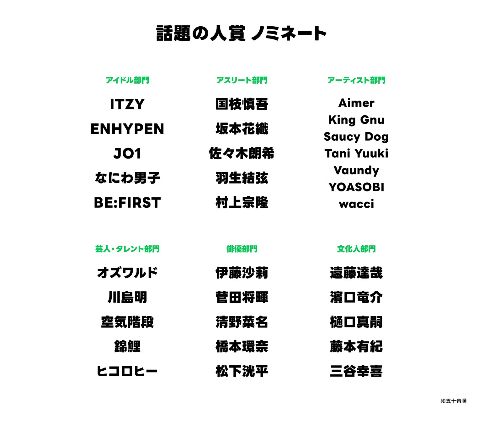 2022年の「話題の人賞」ノミネートは以下の通りです。