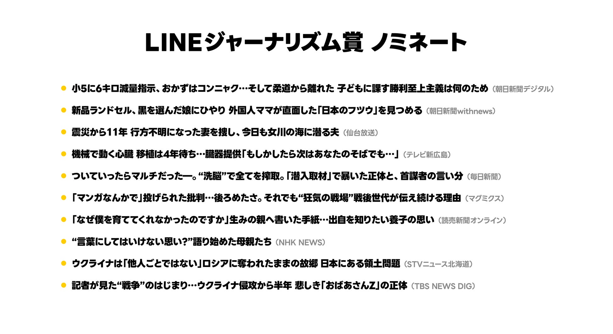2022年の「LINEジャーナリズム賞」ノミネート記事は以下の通りです。