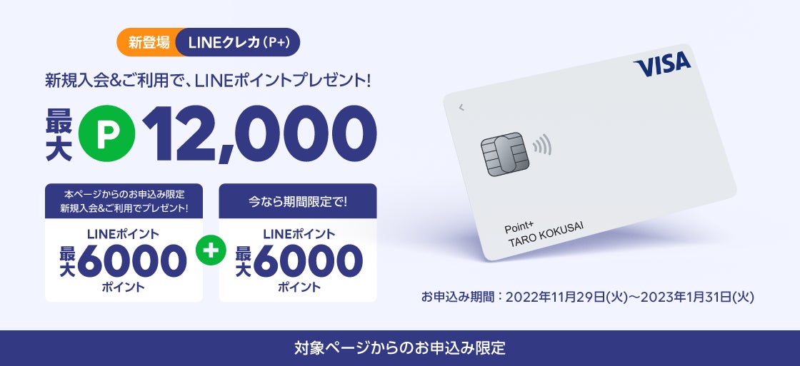 期間中にLINEクレカ(P+)の新規入会とキャンペーンの条件の達成で、LINEポイント最大12,000ポイントをプレゼント