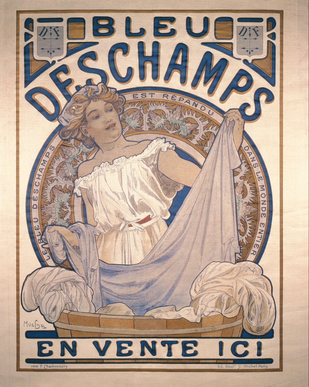 本作は、洗濯用洗剤の広告として制作されたポスターで、ミュシャ特有の流れる髪とゆったりとしたドレープを纏った女性が、洗いたての布を広げる姿が描かれています。